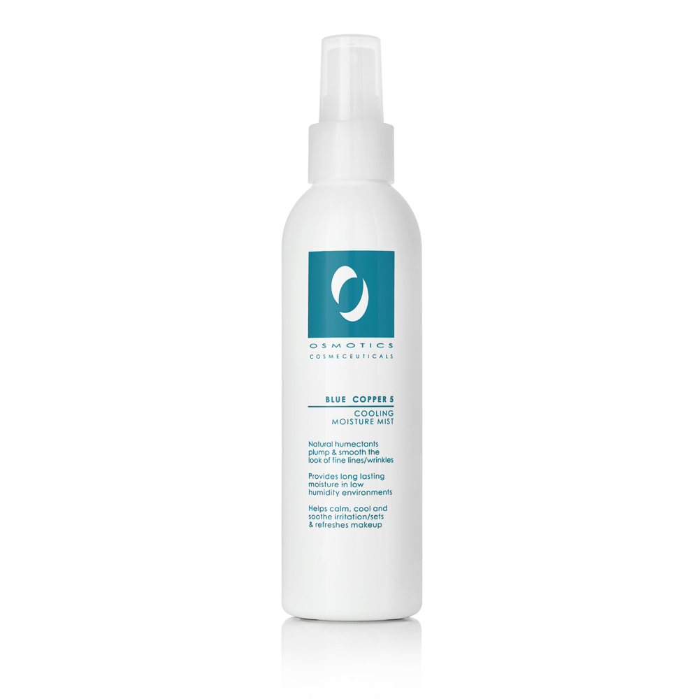 Try a facial mist. A recent addition to many skincare lines is the facial mist. Most just refresh the skin, but Denver-based Osmotics’ Blue Copper 5 Cooling Moisture Mist helps boost hydration and calms irritation as well. Use it midday when your skin feel dry out from all that indoor AC or during airplane travel (a notoriously dehydrating environment for skin). $38 for 6 oz.; osmotics.com
