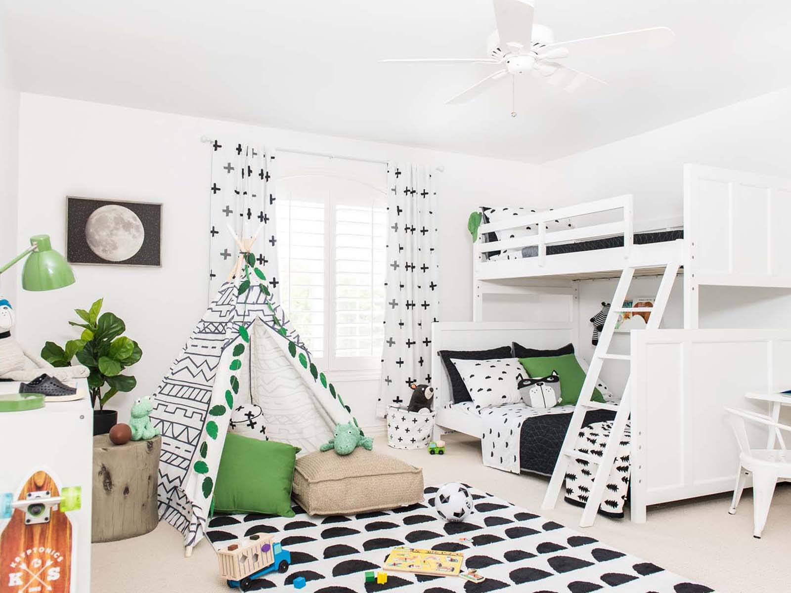 The kid-friendly decor pairs a fresh black-and-white scheme with nature accents in green and brown. “I wanted a palette that any child would love,” Lewis says. “It’s not overly designed for a boy or girl.” A tent drives home the theme, inviting games of hide-and-seek, and a soft rug and pillows offer plenty of space for little ones to plop down and rest—with sweet dreams of the next big adventure.