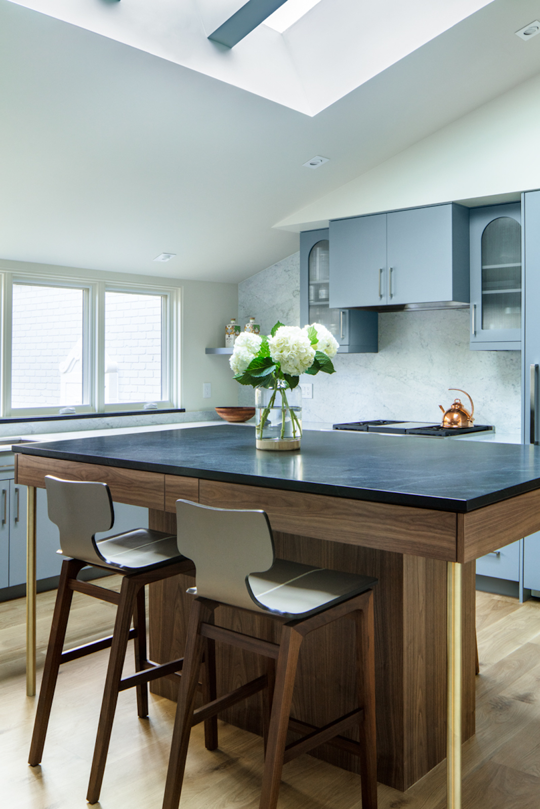 To improve its function and style, he embarked on a thorough remodel, headed up by interior designer Megan Hudacky Larabee and architect Larry Cohen, both based in Denver. “We wanted to bring a bit more modern [style] into the home—without going over the top,” Hudacky says. “A lot of our work was about blending the original architecture and details into the design.” The duo began by reconfiguring the layout to better serve the family’s needs: A wider kitchen opens up to the dining room and great room for better flow, the great room includes a handsome bar for easy entertaining, and a second-level addition accommodates a home office.