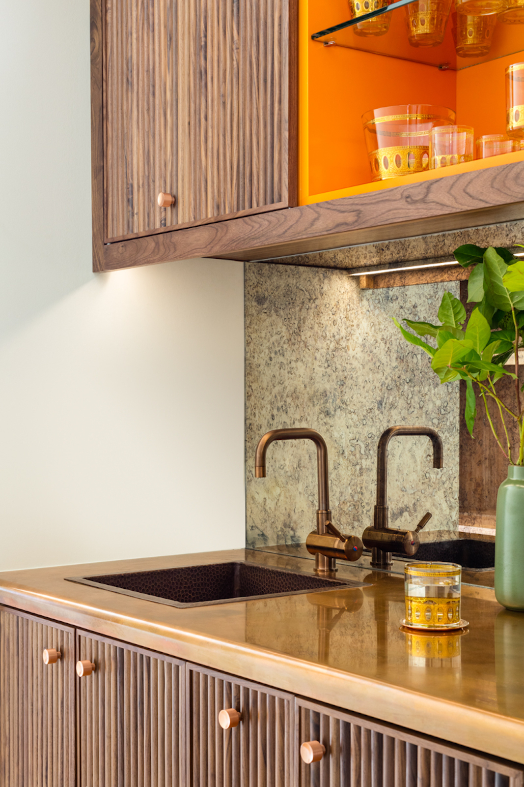 The interiors take cues from some iconic mid-mod designs, including Frank Sinatra’s 1947 Palm Springs home, a structure the homeowner has long admired. Hudacky and Cohen wove in throwback design elements while still modernizing the look. “We wanted to keep a consistency to the project and not just add modern to add modern,” Hudacky says. “We wanted to keep the aesthetic clean and simple while picking up things the owner wanted.”
