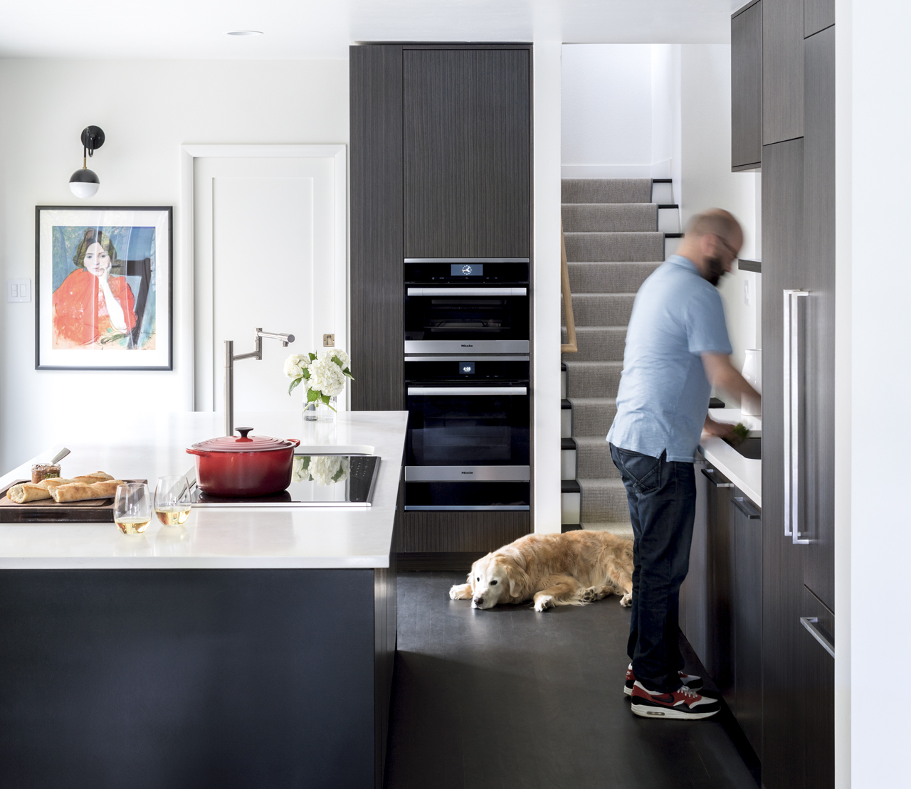 Moore began by flipping the layout of the L-shaped kitchen and replacing an existing wall of cabinets with a 16-foot-long sliding glass door that opens to the side yard—a move that added natural light and maximized square footage. “The new door really makes the kitchen feel a lot bigger,” Moore says. “And by giving access to the side yard, which has a dining table and grill, you get the illusion of more square footage without stealing from other rooms.” The kitchen’s sleek palette and minimalist lines, anchored by ebony veneer cabinetry and white Caesarstone countertops, also give the impression of a more spacious room.