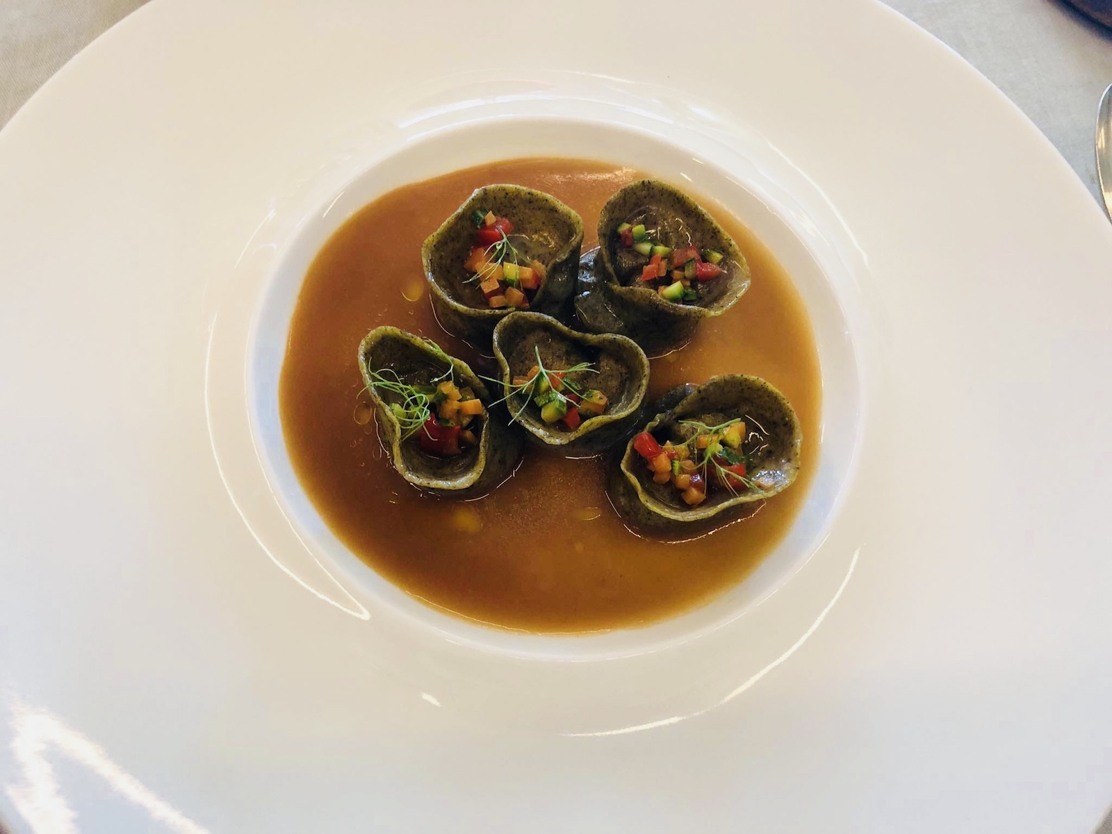We began the meal with amuse bouches of lightly fried sardines and guinea-fowl-cream-filled meringues. We continued with “vitello tonnato,” which is composed of thin slices of seared veal topped with a thick tuna sauce and caper berries. The dishes kept coming: “cannelloni di riso nero” (black rice pasta filled with cod in a seafood fumet); “coniglio di pepperoni” (roasted, breaded rabbit with sweet red and yellow peppers). The pasta, in particular, is always inspiring. We fell for the tortellini con ricotta in particular; the pasta packet’s golden hue comes from the almost-orange egg yolks used to make it. (Since returning stateside, chef Truett has created a hybrid of a few of these dishes by stuffing fresh, egg-rich pasta with rabbit sausage to create a version of “agnolotti del plin.” This dish will be added to Barolo Grill’s menu in the coming weeks.)