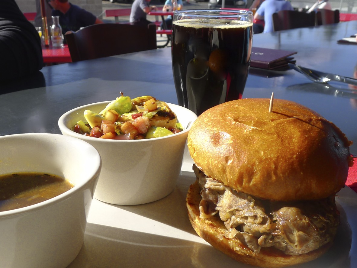 Although there is some tweaking to be done at the nascent eatery, there are plenty of must-order items. Of particular note is Chris Blackwood’s (formerly the chef of West End Tavern) prime rib dip with a mighty stack of house-smoked Meyer Natural Angus beef. Onions sautéed in Avery stout accompany the beef, along with punchy horseradish sauce and a plump brioche bun. Because the meat is so juicy, dipping in the jus is completely optional, but a side of pork belly Brussels and a pint of Oatmeal Porter (available only at the brewery) are not. Place your order and lean back on the sun-drenched patio and enjoy springtime heaven.