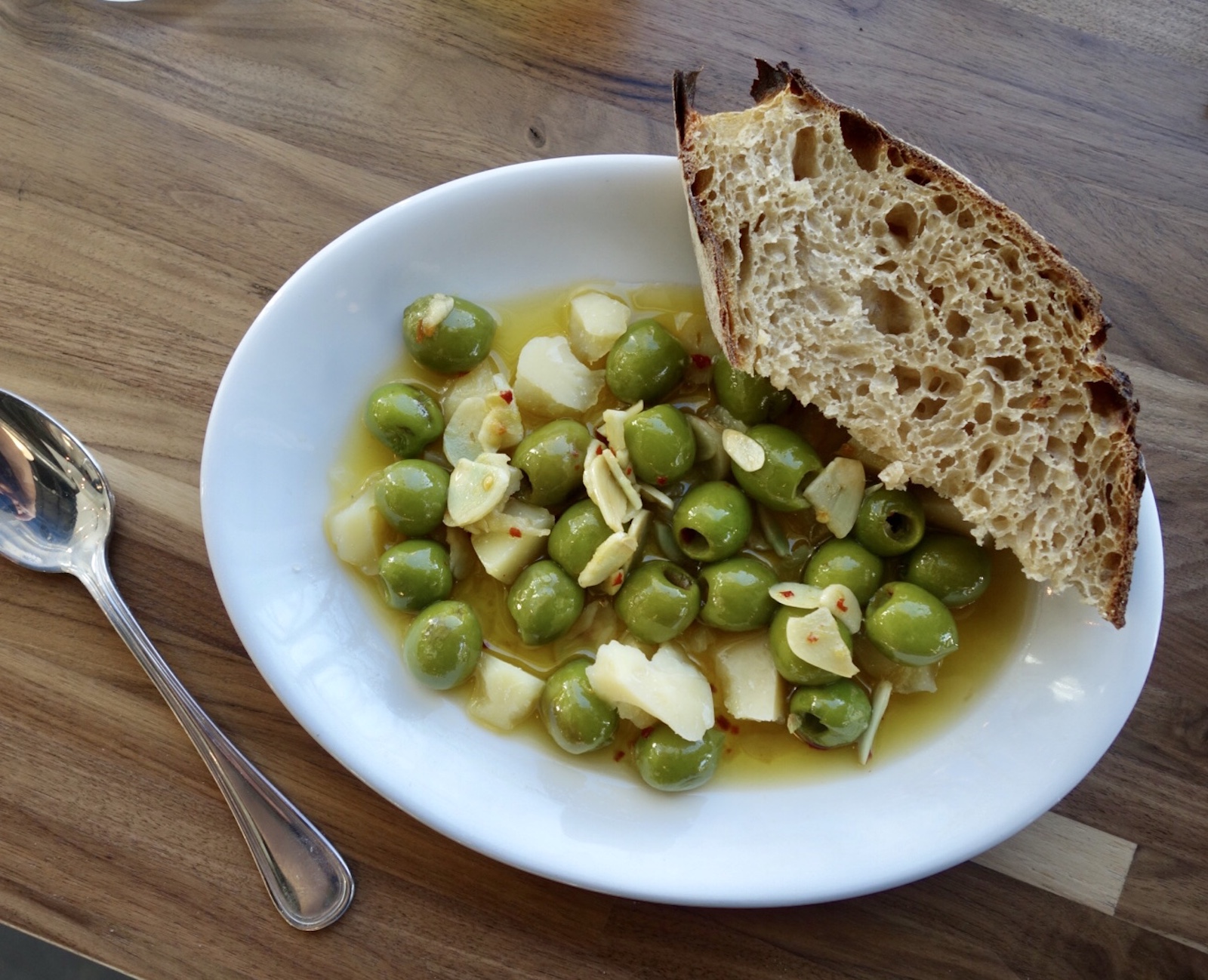 The pizzeria side opens at 4 p.m. Tuesday through Friday and 11 a.m. on Saturday and Sunday. The sunny, modern space—designed by Catherine—quickly fills with patrons sipping cocktails and glasses of wine from the mostly Italian list, sharing dishes of warm, olive-oil drenched olives and Piave Vecchio cheese, and leafing through the collection of cookbooks on the shelves as they wait for their pizzas and simple salads that seem to take a page out of the Gjelina playbook.
