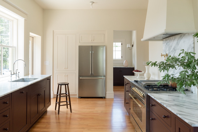“This area probably received the most work, and there wasn’t much that was salvageable in here,” Bagus says. The cabinets, flooring, and an adjacent bathroom and closet were torn out to make room for Calacatta marble–topped cabinetry, an Ilve range with a custom hood enclosure, French doors that lead to the side yard and let in ample sunlight, and a breakfast nook with a built-in banquette. “I did not let any empty space exist, because what’s missing in these old houses is storage,” Bagus says. She finished the kitchen with several modern light fixtures, including a single milk-glass pendant that hangs above the eating nook. “I made the decision to go a little more contemporary with the lighting,” she says. “I’m not trying to create a museum; I’m not that much of a purist. I like the contrast of new and old in a home.”