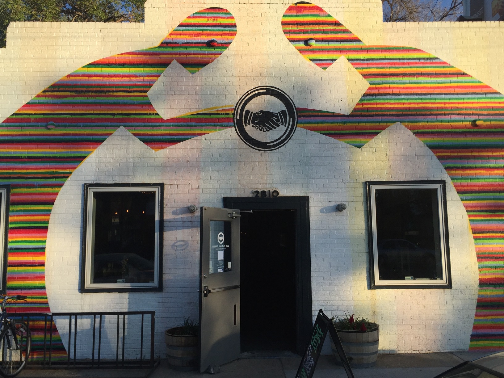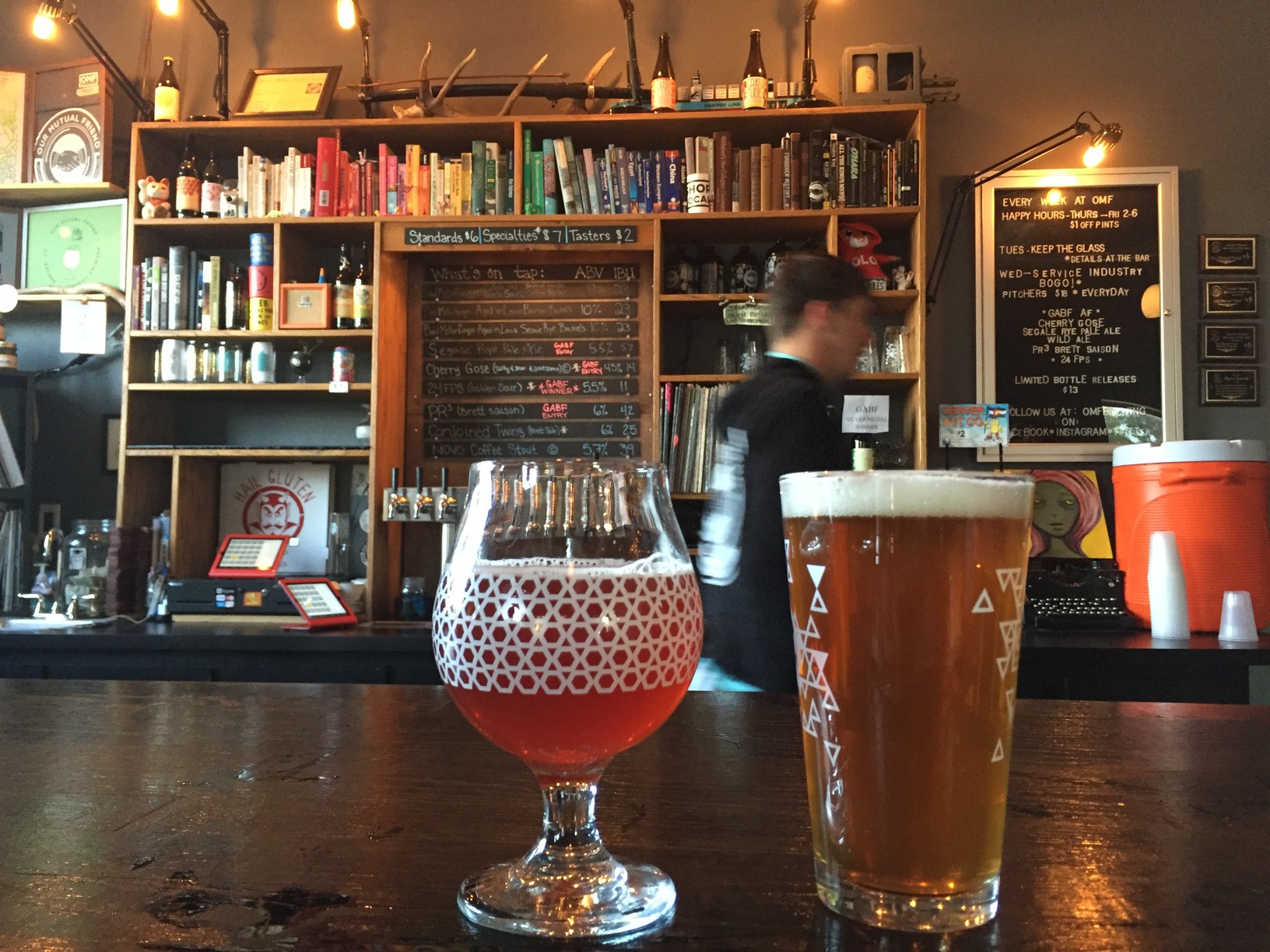 Ambience: What’s more inviting than a massive rainbow-striped mural that nearly jumps off the white brick building it adorns? One look inside the taproom and you can tell OMF knows what their patrons want—good music, quality beer, and a space that fosters conversation. Overall, it’s moderately sized with a multitude of seating options: stools nestled up to a narrow counter that runs the length of one wall, a large community table in the center of the room, a handful of four-tops in the far right corner, and eight-ish stools to belly up to the bar, which is located in the far left corner. Vinyls are always spinning and the large bookcase surrounding the taps is packed with beerology books and random knick-knacks bound to spark chatter. Windows to the right of the bar offer a dimly lit peek into their brewing room.