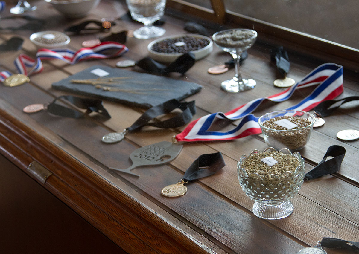 A display case—on wheels—sits in the tasting room. Various awards are on display, mixed in with dishes full of different natural ingredients used in the 22 different spirits Leopold Bros. creates