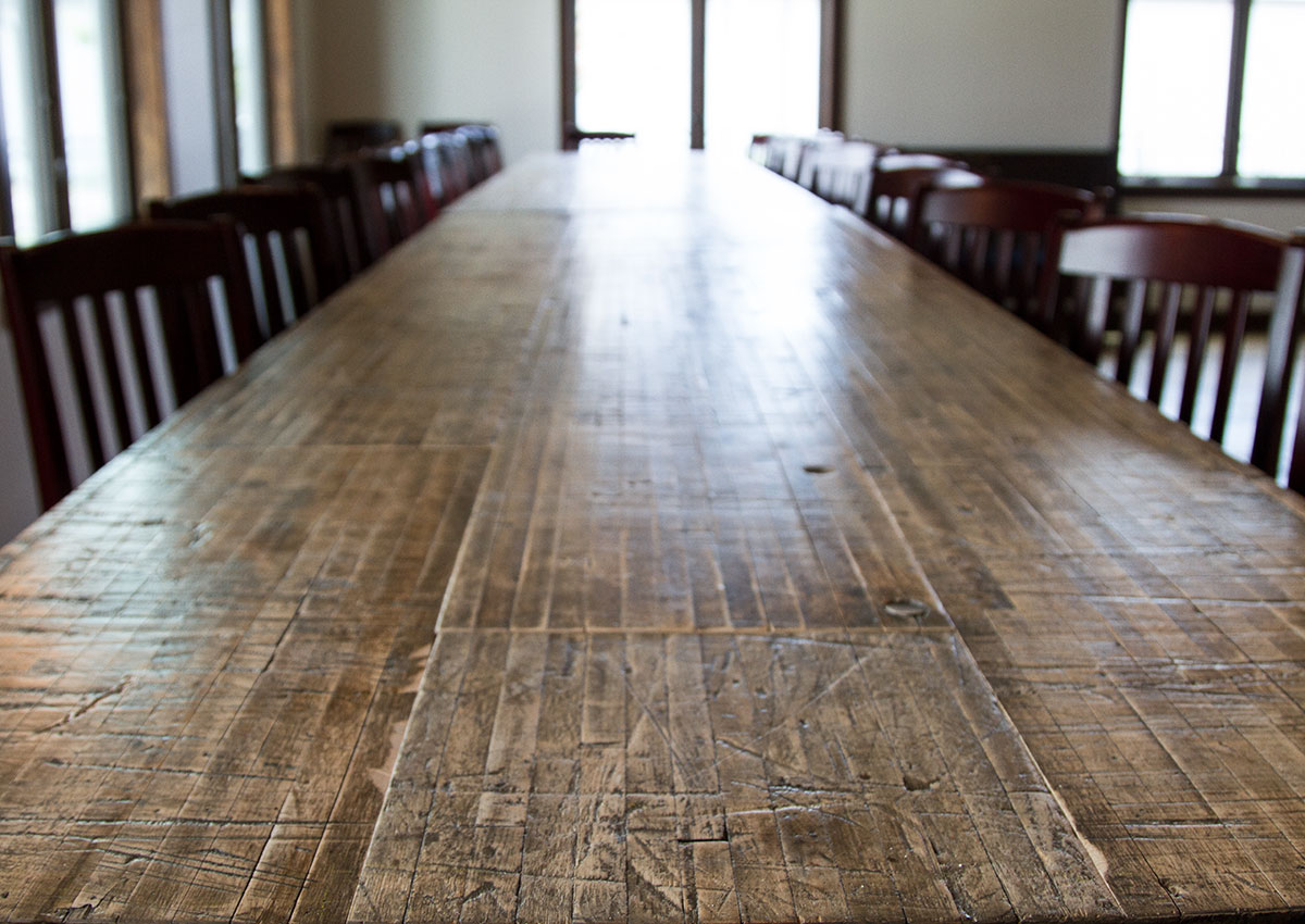 The community table in the tasting room was crafted using reclaimed wood from old rail cars. The bar and floor are fashioned from floorboards used in an Ohio sawmill. The light fixtures were salvaged from a ship in South Carolina