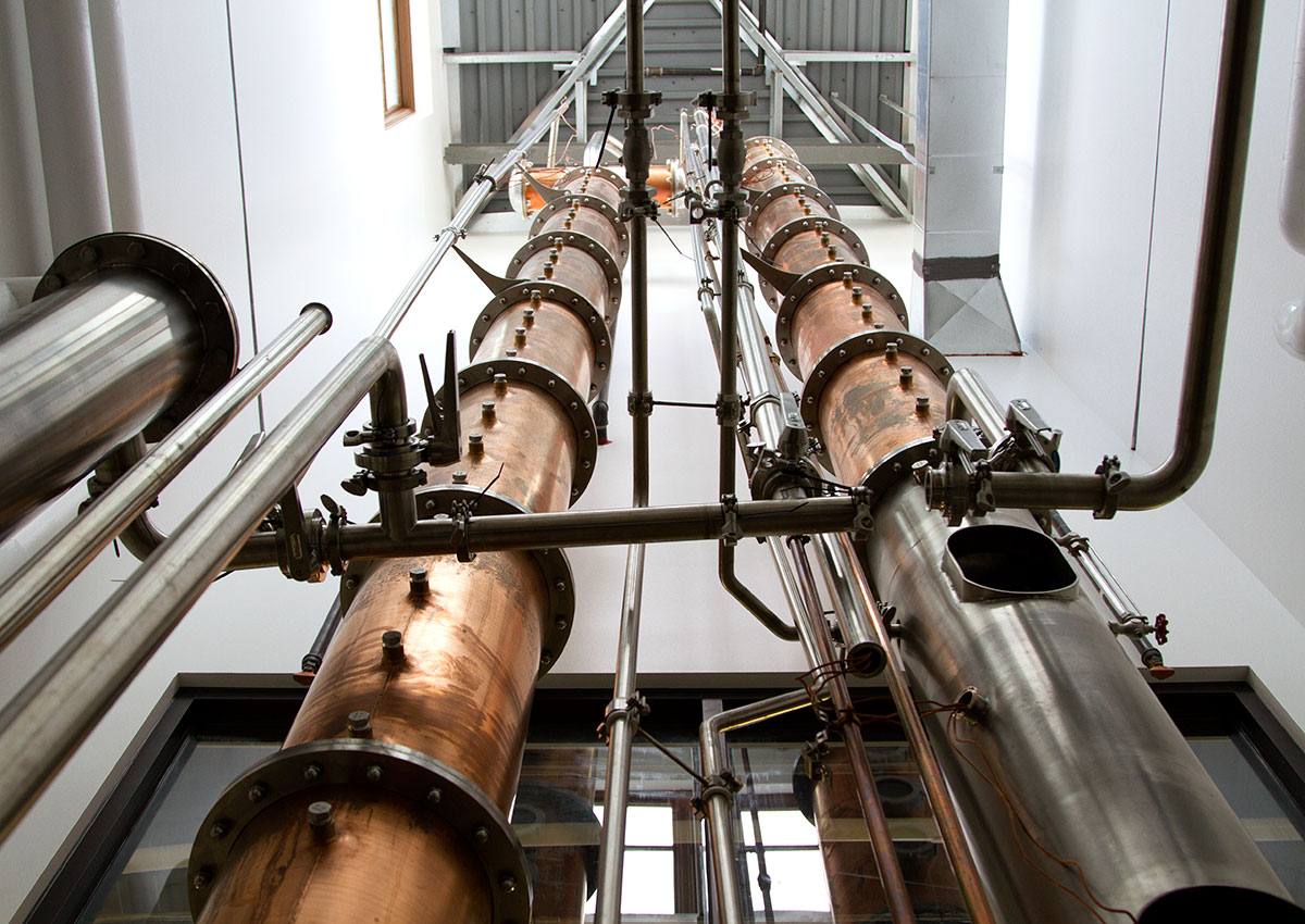 This is the vodka still. After the fermentation step, the mash mixture is added to a still (not pictured) where the alcohol vapor is collected. The alcohol vapor is then transferred to this still, where it is boiled, passed through a series of perforated plates and into a condenser. From the condenser, the vapor turns into a liquid and pours out of a spout connected to the still. The liquid created is the Silver Tree American Small Batch Vodka