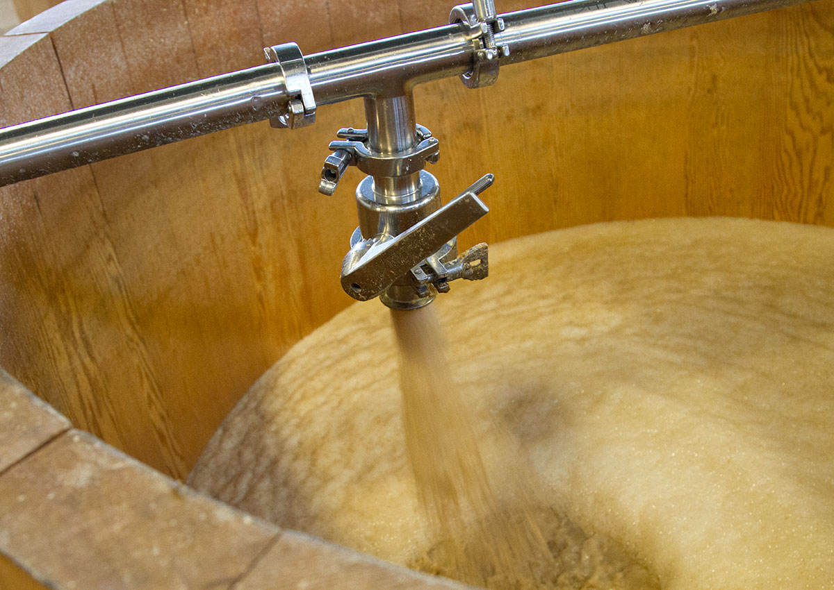 During the fermentation step in the distilling process, the mash and yeast (which have just been introduced and combined) are transferred into open wooden fermentation tanks. They will sit and ferment for a few days