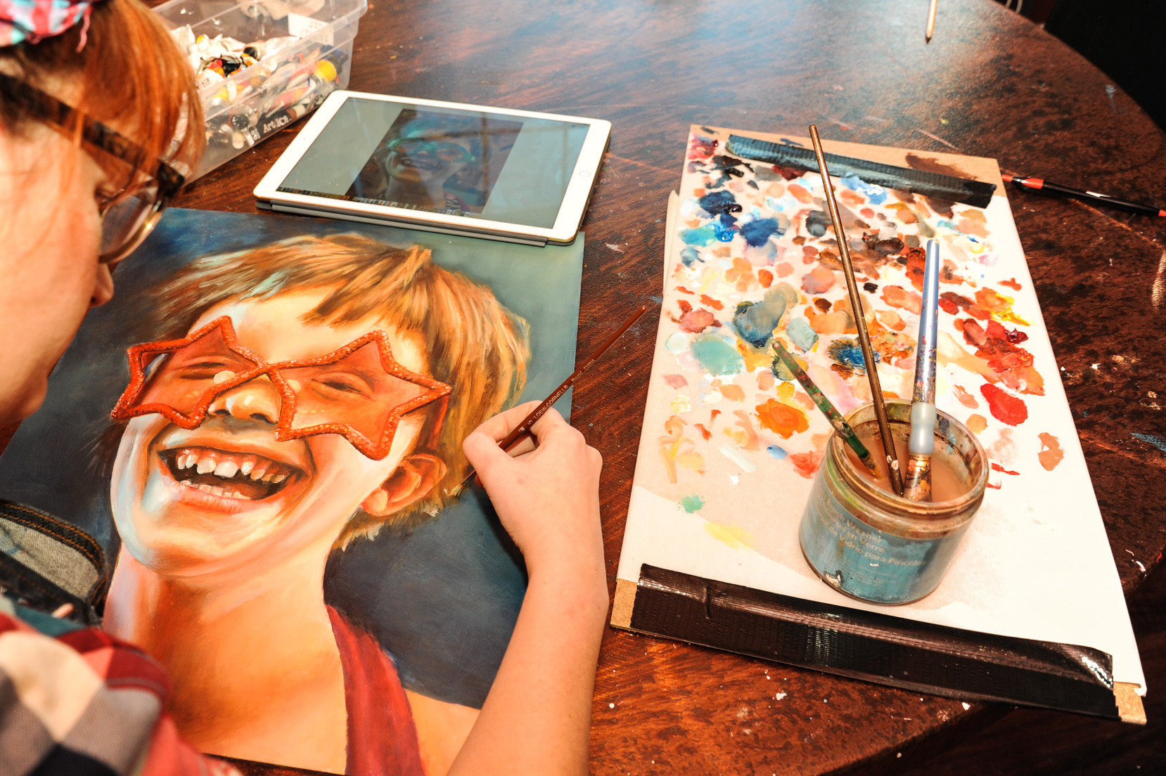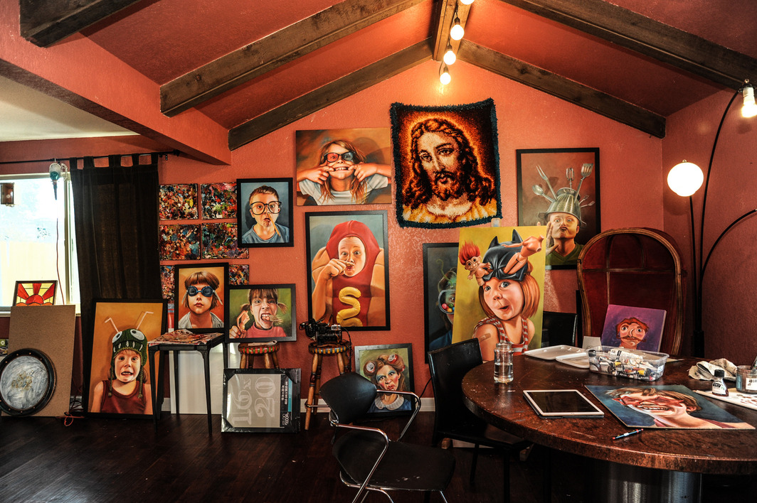 Each painting in the series started as a photograph. Haverland invited young subjects to explore different props (sunglasses, crowns, toys), and snapped stills of them displaying different facial expressions. She then chose one image or combined elements from several to create her paintings.