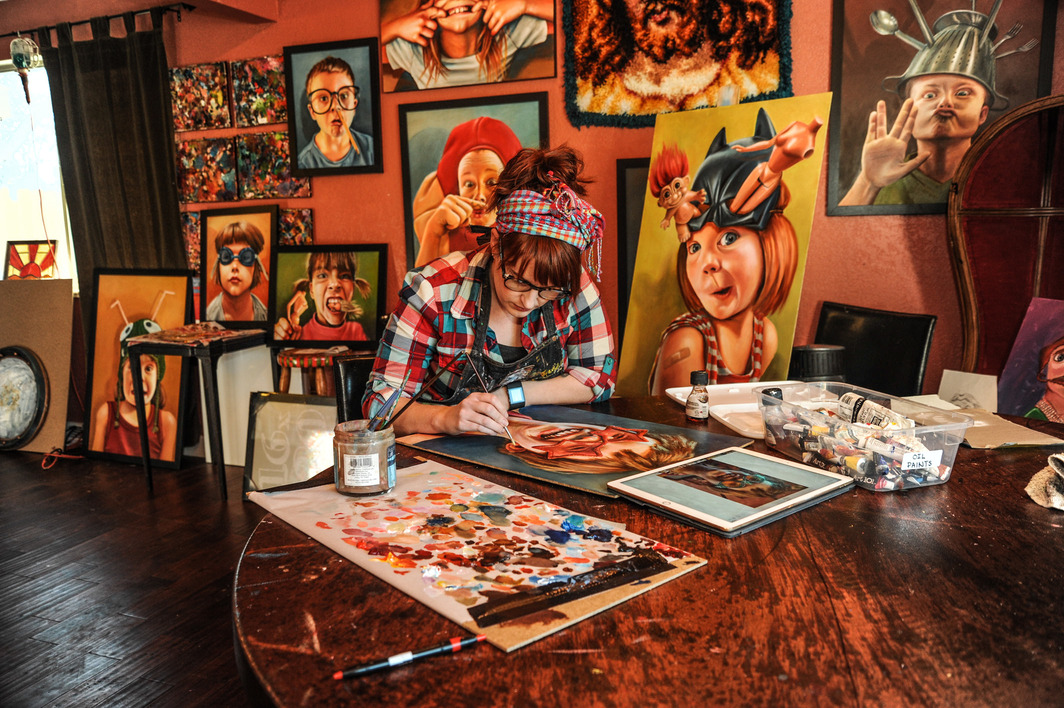 Haverland works solely with acrylics but has recently been exploring textures through oil-based paints. Haverland has a way of seeing and appreciating color and dynamic shading, even down to the flesh tones and the way light touches the skin of her subjects. She hopes her work will not only make visitors smile, but also shed a light onto the way we view things. As for the children she worked with and those who will see her work, she wants to inspire them to recognize that art doesn’t always need to be serious—it can be light and fun.
