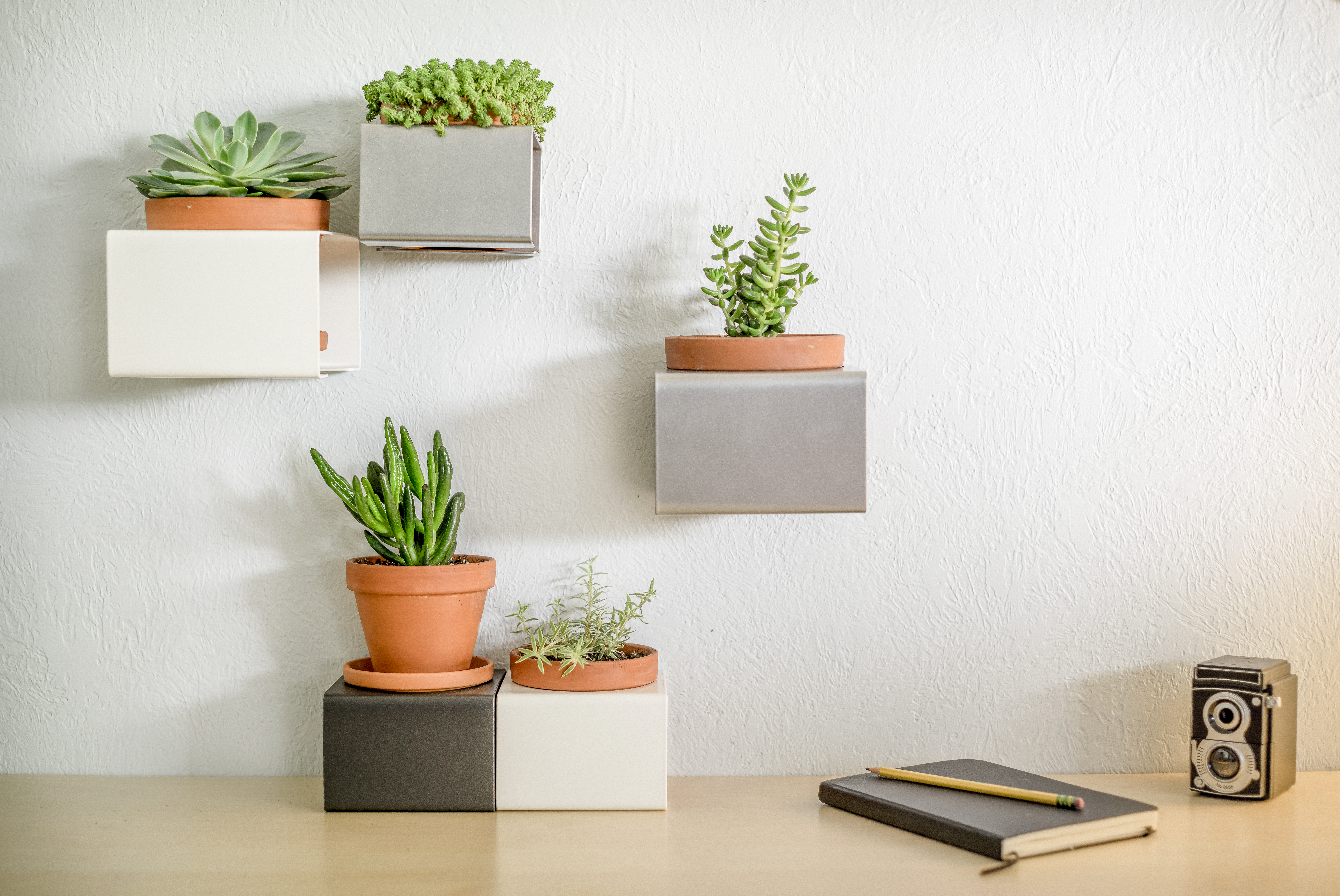 Tighe’s designs, which pair powder-coated steel planters (made locally) with clay pots and saucers, are brilliantly modular: Just mount the planter to the wall or suspend it from the ceiling with wire, and lift out the pot to care for the plant. With clean lines and neutral hues, the planters are intended to “showcase the natural curves and colors of the plants,” Tighe says—which means your herb garden or succulent family becomes the main attraction.