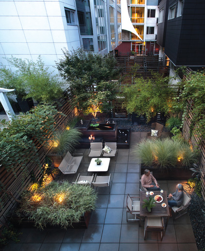 Soft greenery and Asian-inspired landscaping create a lush escape in the heart of downtown.