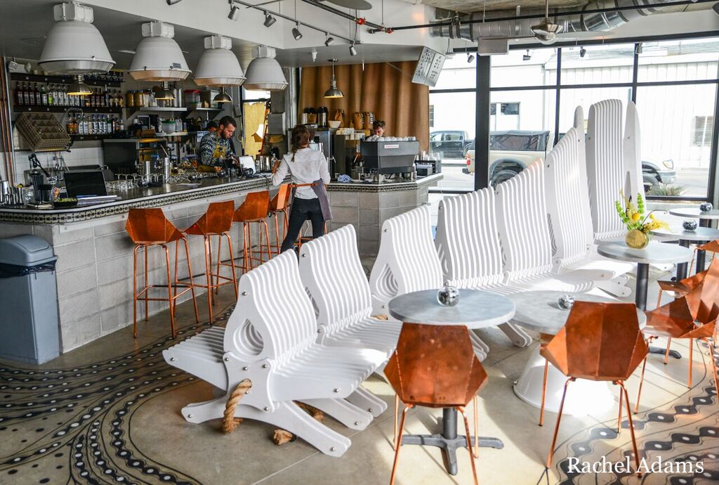 This sleek Alameda Station cafe transitions seamlessly from day to night.