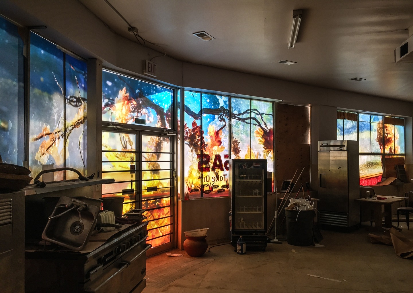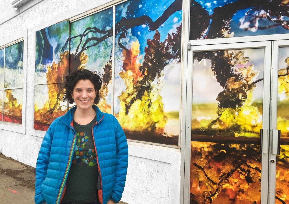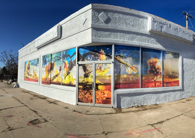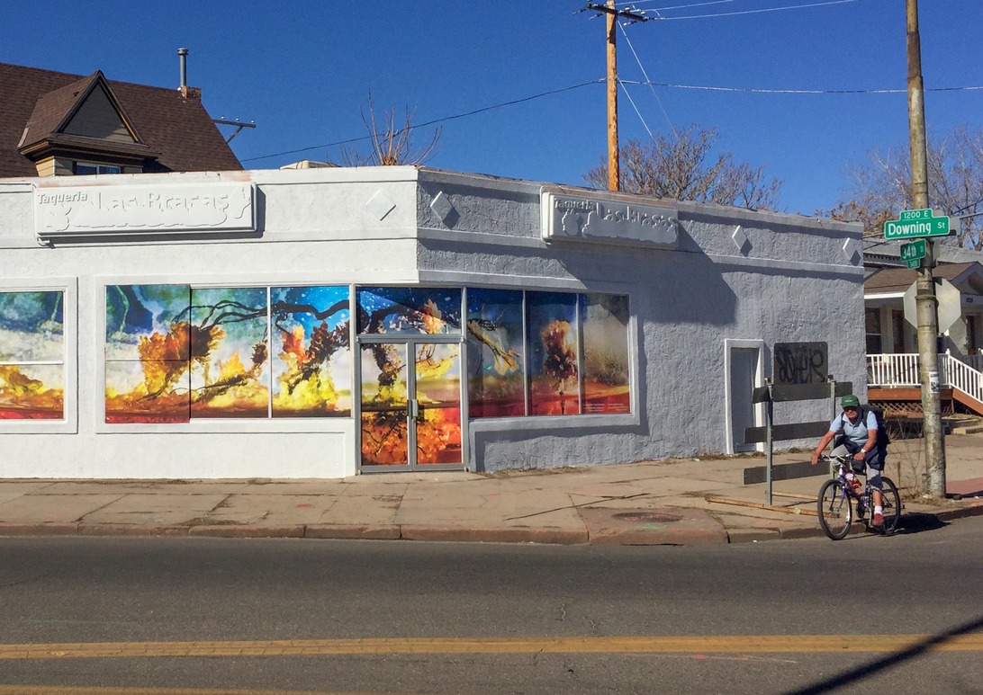 Growing crystals isn’t just a childhood science experiment anymore. San Francisco artist Liz Hickok brings her outlandish and vibrant crystalline imagery to the windows of a vacant building in RiNo. The mural, entitled “Preternatural”, is a collection of superimposed photographs of tiny environments made up of crystal solution, wire armatures, and colored dye. After creating and capturing the environment, Hickok expanded her images to superimpose them on the windows of an abandoned taquería at the corner of Downing and 34th streets.