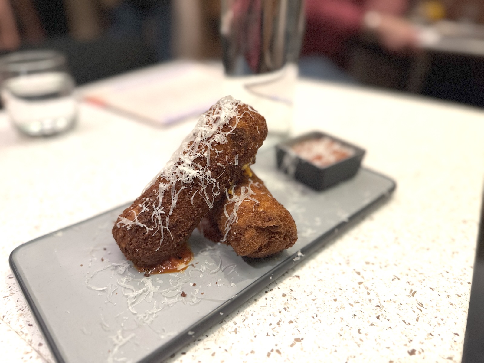 The couple note that they wanted to open a pasta joint that doesn’t follow the standard Italian or Italian-American playbook. You’ll find familiar pasta styles—bucatini, cavatelli, and agnolotti, for example—but those are dressed with dirty martini sauce, stroganoff with everything-bagel seasoning, and pea-and-potato samosa filling, respectively. Even a basic fried mozzarella stick gets reworked; its interior is a gooey blend of cheese and marinara and the whole thing is scaled up to almost ridiculous proportions. Expect similar creativity with the bar program, especially the NA beverages, an important part of the experience for the Blauvelts because of their dedication to providing an inclusive space for both guests and employees.