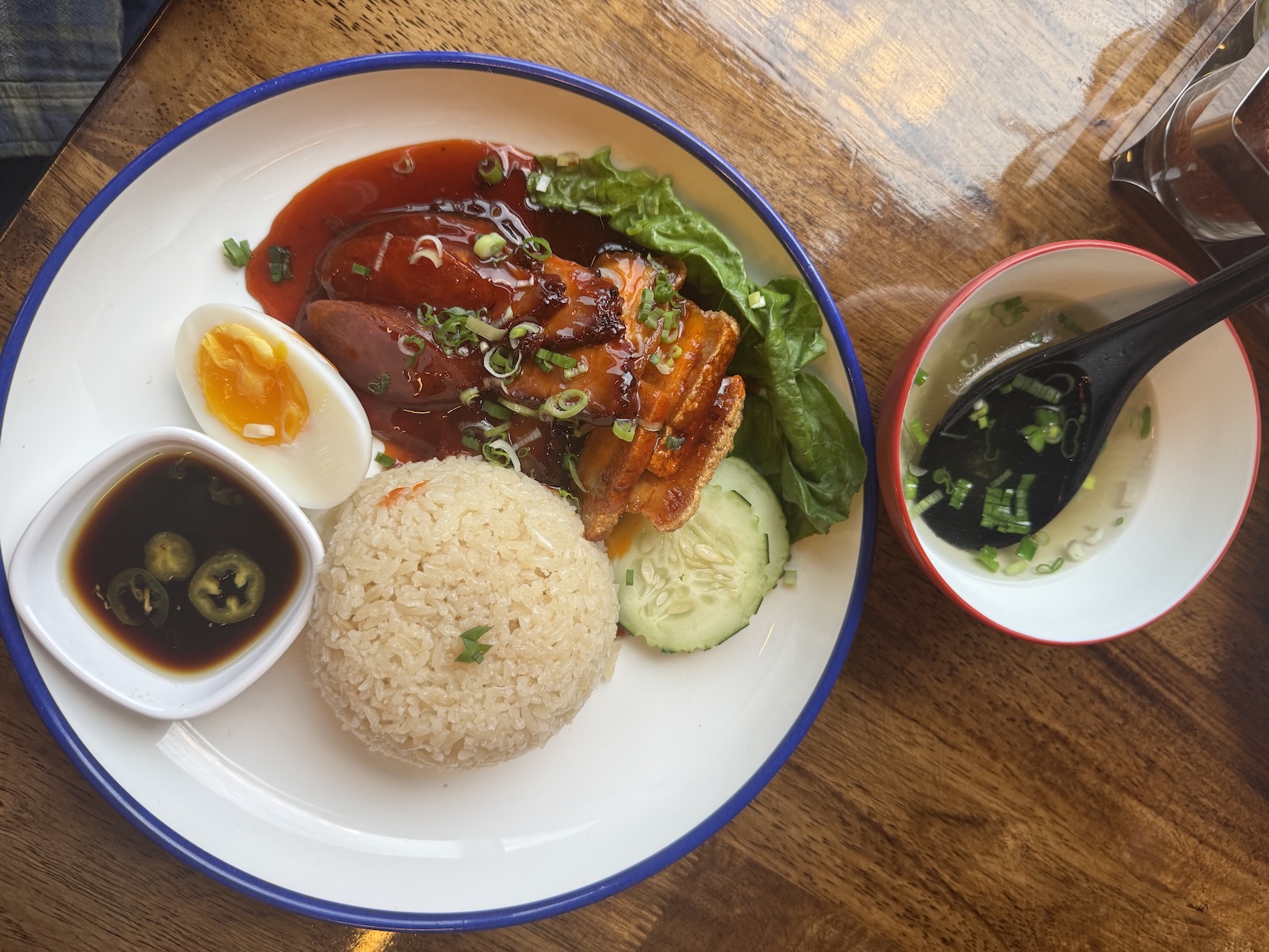 Her effort, along with that of business partner Dueanphen “Pom” Rungrueang, is evident in the beautiful dining room, split between a raised seating area intended to evoke an outdoor food market and a lower level (where you might spy a photo of Hardacre’s father) that she designed to look like a typical Thai home. The menu grounds itself in street-food specialties from Kanchanaburi and Chiang Mai (Rungrueang’s home town), with beefy Mae Klong noodles (often called boat noodles), powerful Khaosan tom yum noodles, and the amusingly named Khao moo moo moo, a dish featuring pork (moo in Thai) three ways, as sausage, glazed belly, and thin-sliced barbecue.