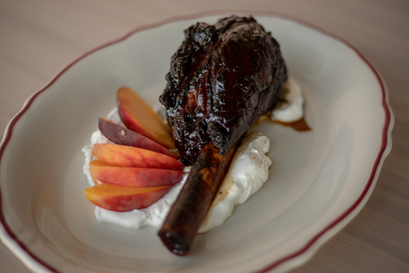 Round three finds you in the land of large plates, featuring meats, seafood, and vegetables cooked as close to whole as possible. An entire head of cauliflower, roasted in the wood oven, sits on a bed of airy whipped feta tinged with Aleppo pepper. Gorgeous, crispy-skinned rockfish fillets are paired with a rich Moroccan tomato-pepper stew, the whole drizzled with tahini that’s been spiked with cilantro, parsley, and lime. And lamb shank, all shiny and lacquered with pomegranate glaze, comes with more whipped feta and juicy Palisade peaches.