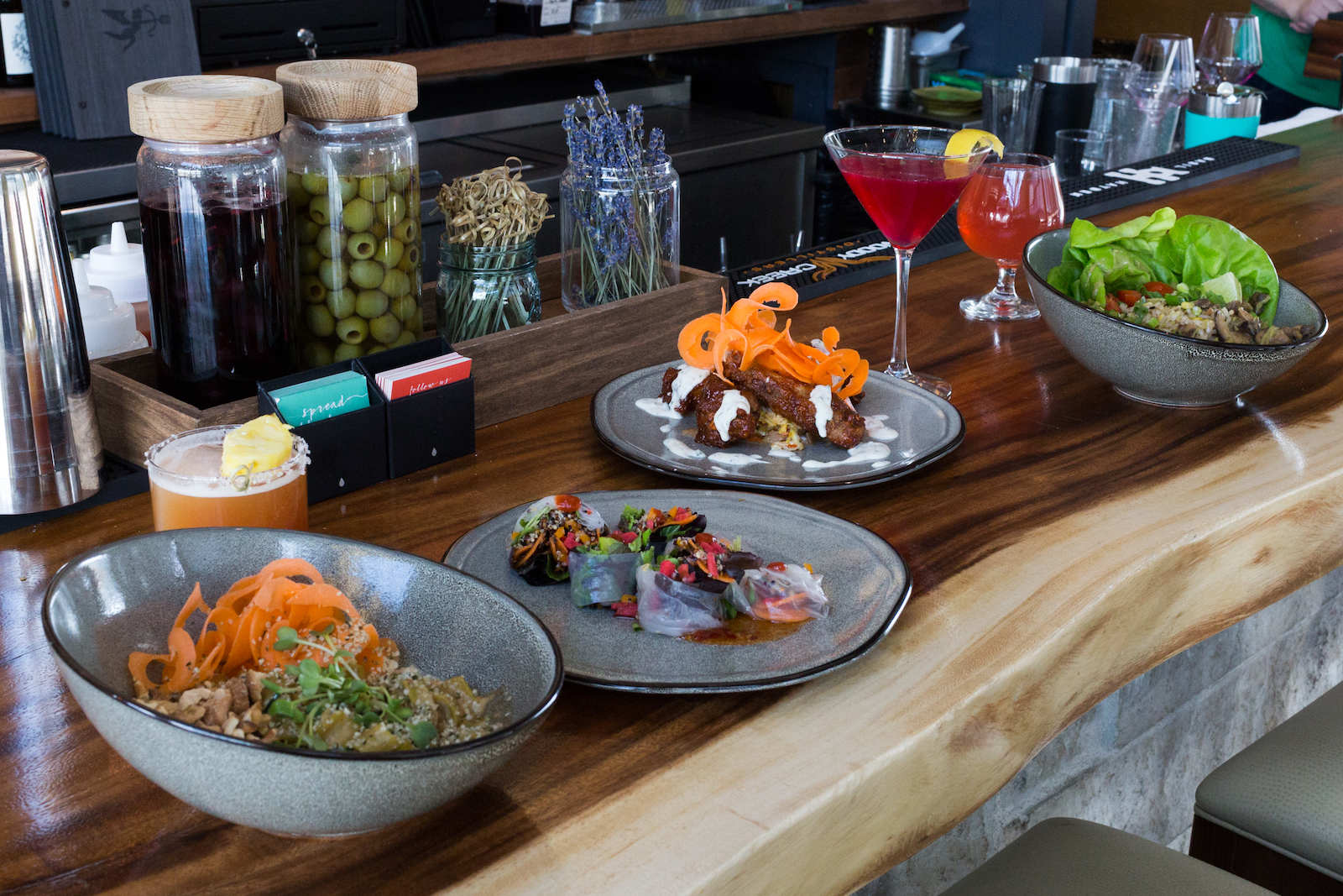 The summer menu satisfies earthy cravings with a grilled romanesco hummus hybrid that arrives dusted with smoked paprika and organic activated charcoal, alongside handmade seed-loaded ancient grain crackers and crisp raw veggies. Meaty duck wings are tossed in a sweet, smoky cherry mezcal Sriracha that’s tamed with a buttermilk drizzle. And the super food salad is a shot of natural energy: a vibrant bowl filled with mixed greens, chia, avocado, Manchego, miso-glazed organic mushrooms, peppadew peppers, and toasted coconut dressed in a turmeric vinaigrette.