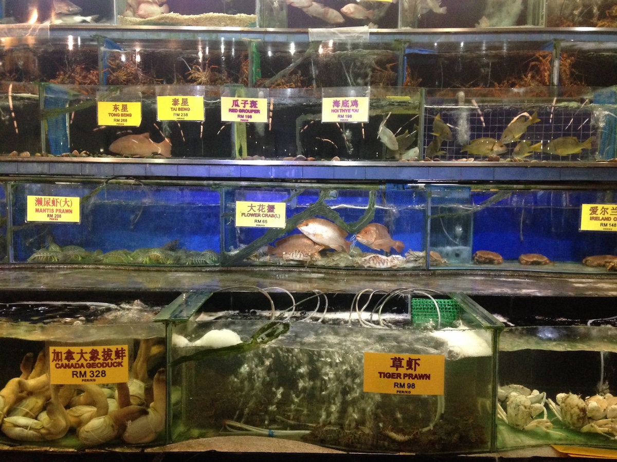 Kuala Lumpur: You know how in the U.S. you open a menu at a restaurant and order what sounds good? Here, you peruse the tanks and order what looks good. This is the display area in the front of the restaurant where we ate. We had geoduck sashimi, stir-fried abalone in oyster sauce, chili crab, steamed black bass, razor crab with a garlic condiment, and fried mantis prawn. On our last night, we went to Jalan Alor which is the downtown street food market in Kuala Lumpur. We ate an incredible dish of barbecued skate wing and stayed out way too late. It was hard to wake up at 4:30 am. for our flight to Penang, which is by far the best food island in the world