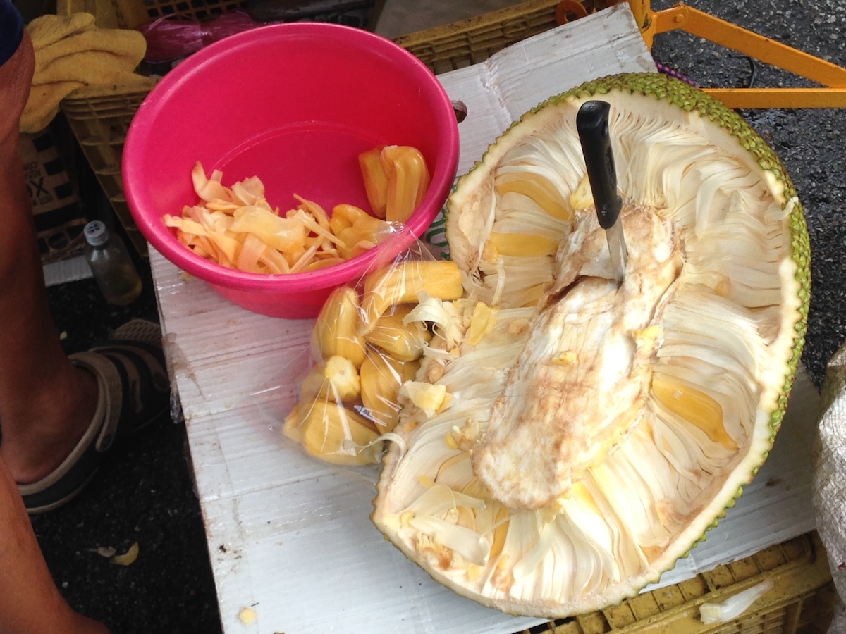 Penang: Jackfruit, which is from the mulberry family, is often used in desserts or as a topping on sweet, sticky rice. The flesh is starchy and fibrous, and it tastes like a combination of apple, pineapple, mango, and banana. This is a single jackfruit; as the largest tree-borne fruit, they can grow up to 80 pounds