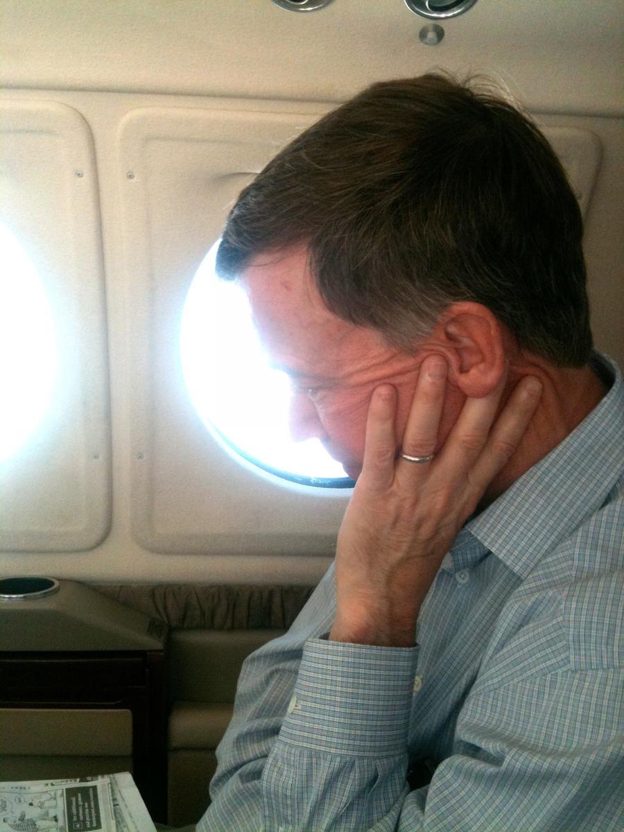—Images courtesy of Maximillian Potter. From top: 1.) Hickenlooper en route to Aspen in July, 2011 to attend an economic conference. 2.) A snapshot of Potter’s home office and some of the notes he compiled over the year he spent with the Governor and his team. 3.) The Governor meets with Occupy Denver protestors in October, 2011.