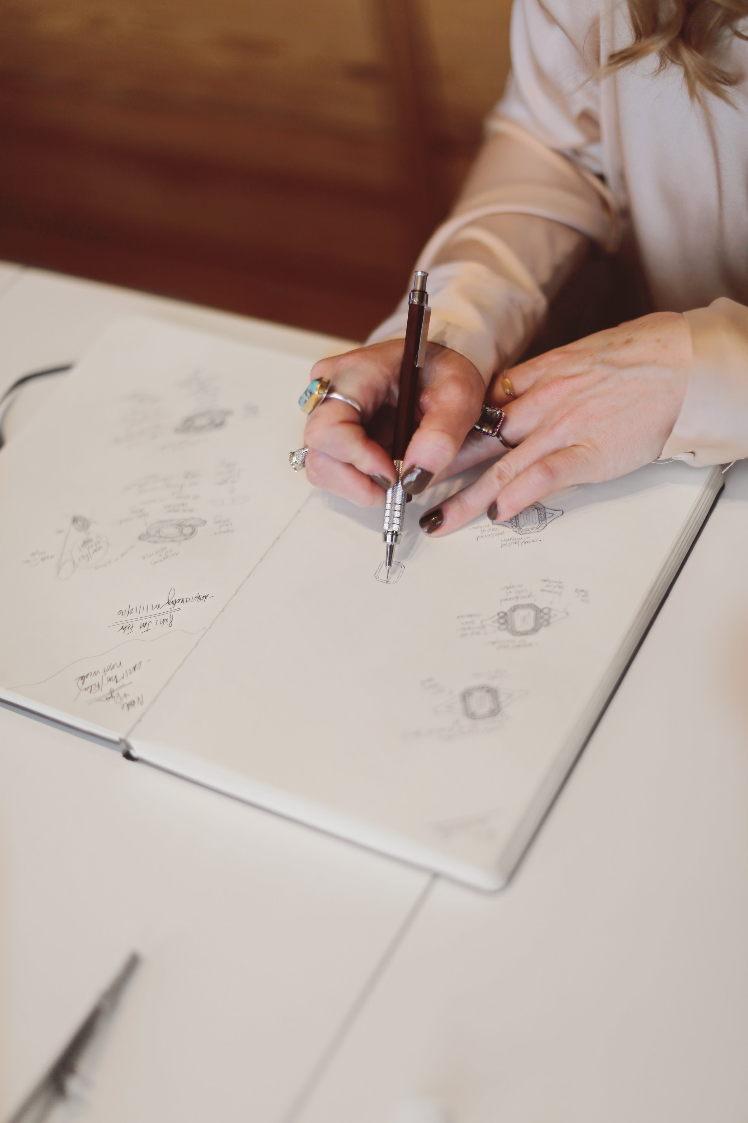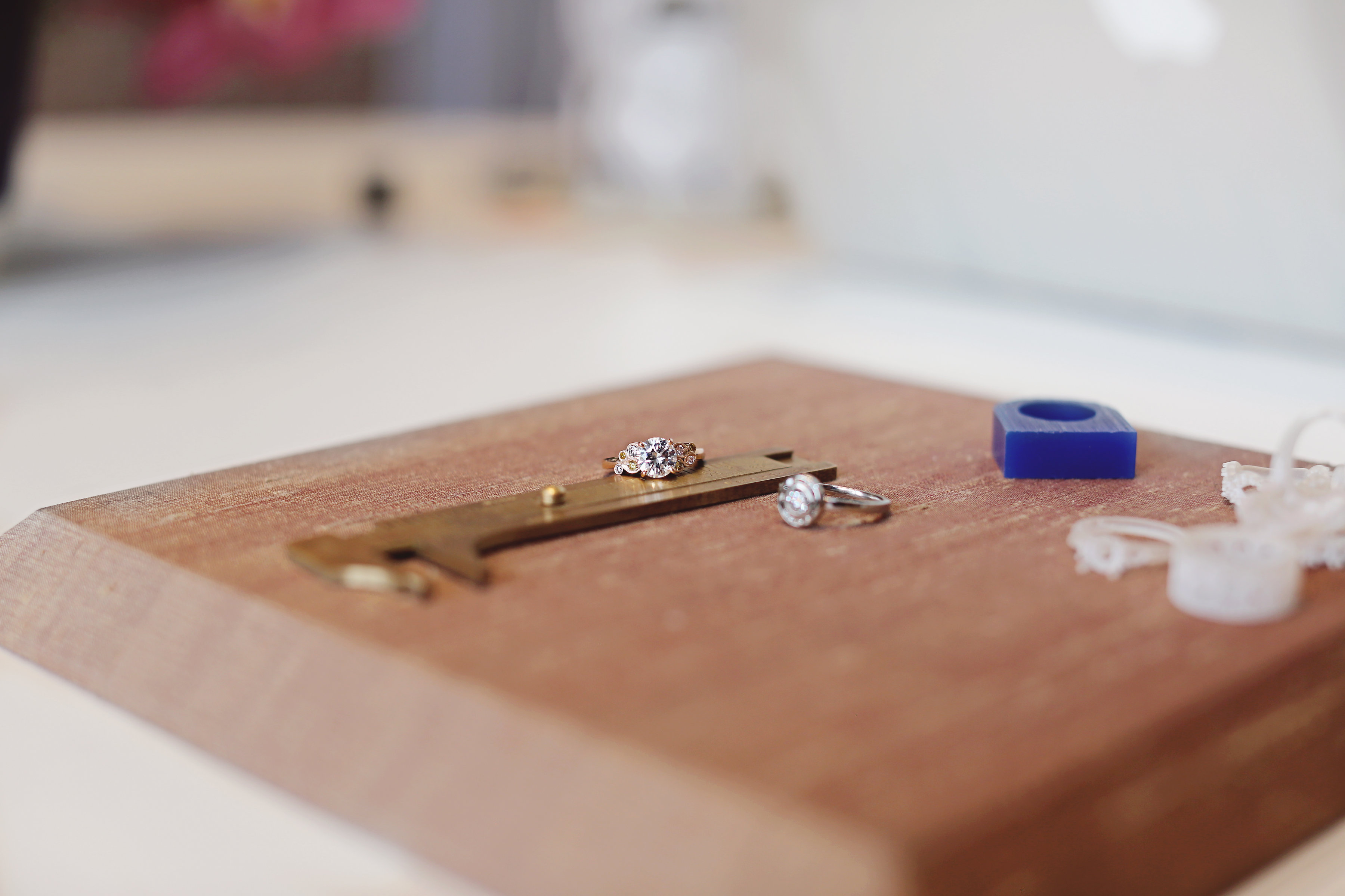 Here’s how it works: When you first contact Sparks’ studio, she’ll schedule an initial consultation—either in person or on the phone—and walk you through the process. Once you decide to move forward, the Loaner Ring functions as a pretty placeholder: You’re lent an Abby Sparks cubic zirconia solitaire set in sterling silver to propose with, along with a ring box, small bottle of Prosecco, two champagne flutes, a box of champagne gummies, and a card explaining the custom design process for the bride (check out Sparks’ step-by-step guide here). Couples are generally ready to begin designing their ring within 30 days of the engagement, although Sparks is flexible on timing. The bride turns in the solitaire once Sparks delivers her final ring.