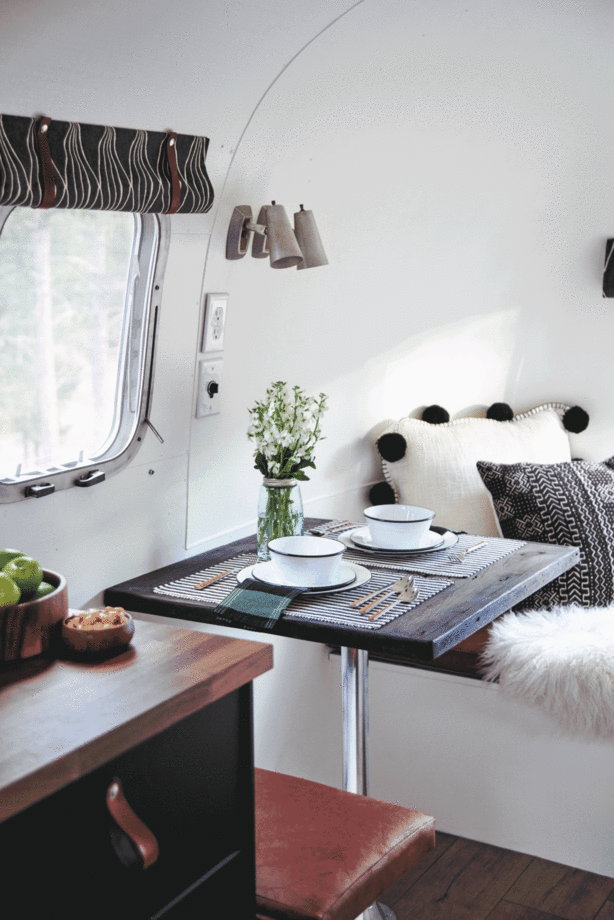 All this function meets its match in the Airstream’s style: Cole aimed for the sophisticated look of a guest room in a boutique hotel, choosing luxurious finishes (think: Ann Sacks subway tile and rich walnut countertops), tribal-patterned fabrics, and stylish accessories in a bold black-and-white palette. “In such a small space, sticking to a formula (black plus white plus wood) ensures it’s streamlined and really flows,” she says.