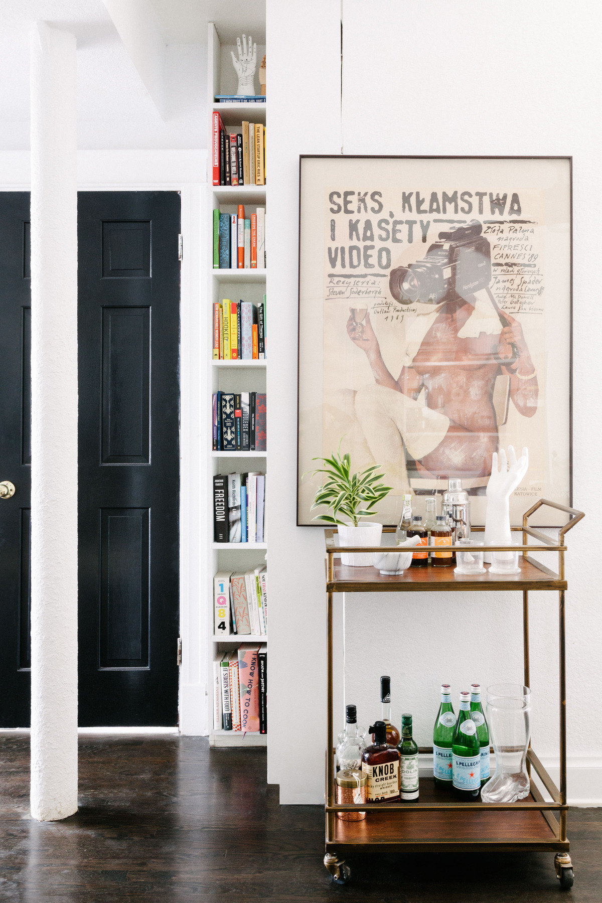 3. Get creative with furniture. The desk in the home office is an IKEA counter placed on top of two IKEA drawer units. The bar cart in the living room displays accessories and offers extra storage.