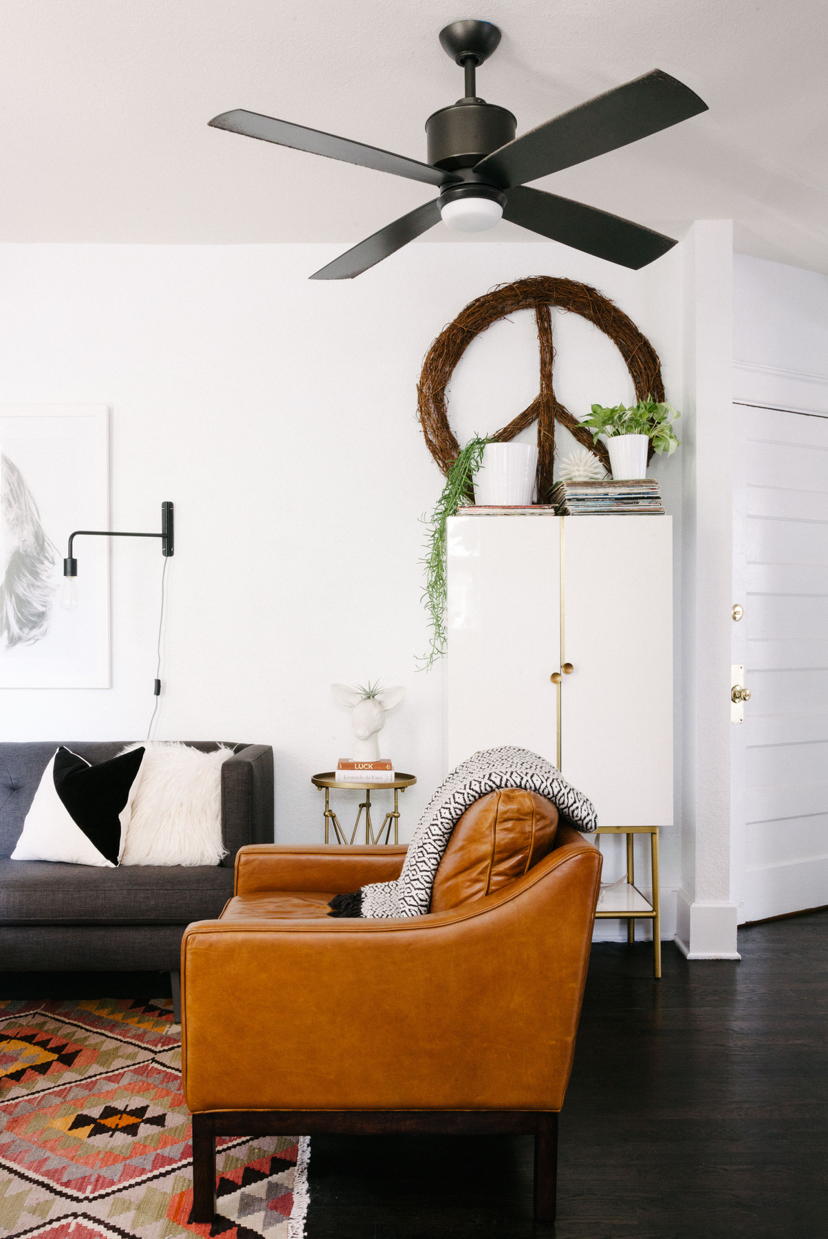 A CB2 sofa and sconces and a West Elm coffee table balance a vintage kilim rug found on Etsy. The print above the sofa, “Girl Smoking” by Lita Bosch, adds a little edge to the scene. Photo by Morgan Rachel Levy.