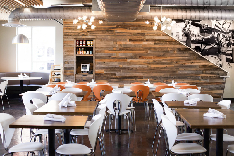 To the rescue: Stapleton’s 1.5-year-old Four Friends Kitchen, which was designed with families in mind. The restaurant’s high-impact, playful aesthetic serves as a fitting backdrop for Southern-inspired, locally sourced food. For the 4,250-square-foot space, owners Kurt and Sarah Pletcher and Tim and Genefer Thornton—husband-and-wife couples, next-door neighbors, and parents of young children—wanted a playful vibe with a modern look that would cater to families and their unique needs.