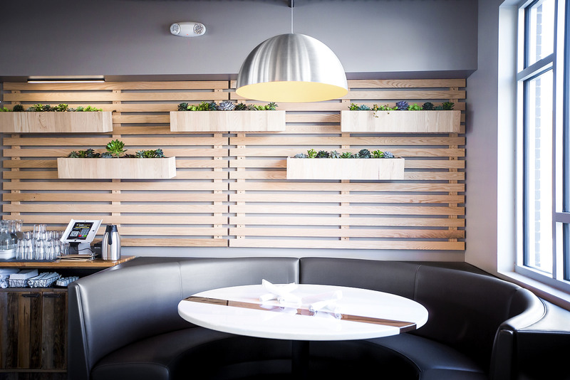 So designer Jayna Kline of Rowland & Broughton created a space that’s appealing to and appropriate for patrons of all ages. Stained concrete floors clean up easily, and wood-and-white tables (maple and painted medium-density