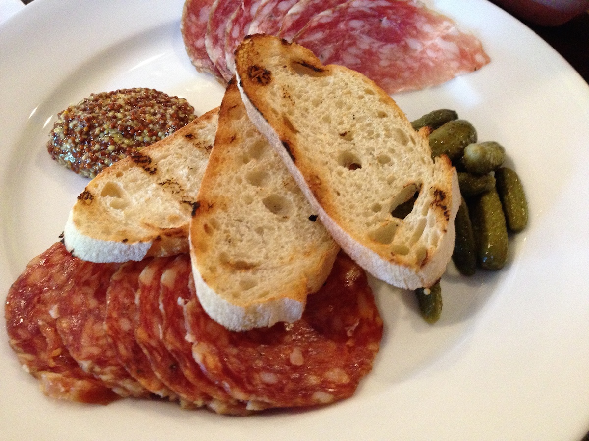 To begin, we ordered the charcuterie board (we picked the sopressata and calabrese; $10) and the cauliflower “popcorn,” which was grilled with curried almonds ($4). As we nibbled, I took in the surroundings. There is a small patio on Oneida Street and a massive glass garage door that opens to a beer garden on the side and allows light to flood the dark-wood interior and furniture. One of the owners, Josef Sykora, also owns Boulder-based Sticks & Stones Woodworkers, LLC and created the eatery’s custom-made pieces, including a booth with a car wheel and tables with U.S. Geological Survey markers. (Sykora’s partners—Dipesh Amin and Sita Kedia—also work two jobs; by day they are physicians.) It was early, but there was a smattering of couples and as we ate, the space filled with multigenerational family dinners. The mix of patrons and the environs felt modern but homey, like a big neighborhood party.