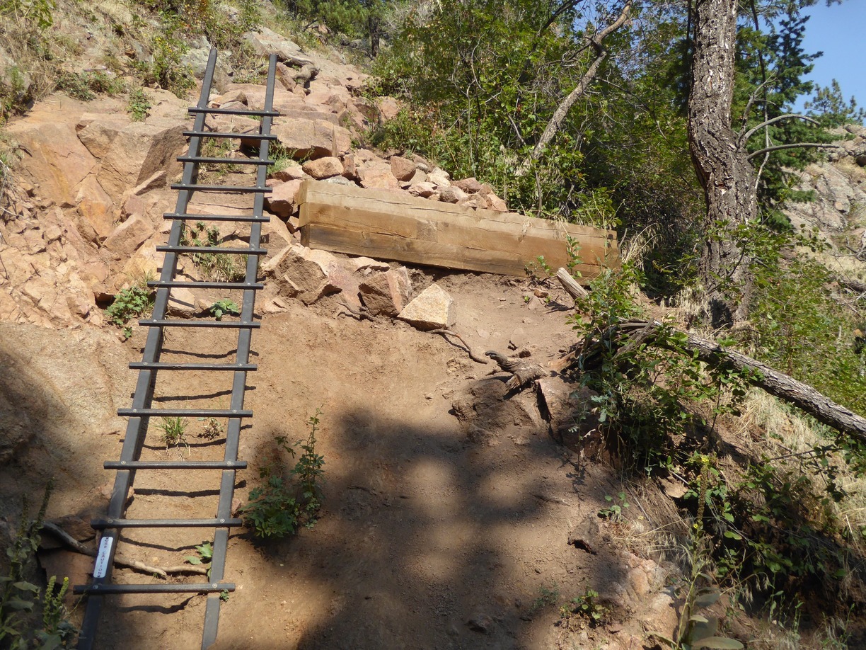 Continue to descend the Saddle Rock Trail, which in places is quite steep. In one notable spot, there is a ladder that Boulder Open Space and Mountain Parks (OSMP) has installed to replace a section of the path damaged in the 2013 floods. Although tall, the ladder is inclined into the slope and easy to get on and off, so I had no difficulty navigating it even carrying hiking poles.