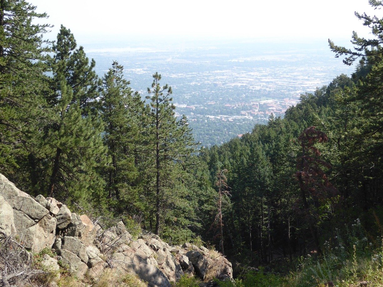 From the shelter, continue left on the Ranger Trail an additional 0.3 miles through the majestic ponderosa pine forest to the junction with the E.M. Greenman Trail. Veer left again here to climb another 0.6 miles to the junction with the Saddle Rock Trail and begin to follow this downhill. The openings between the trees near this junction offer nice views down to the city and the northern foothills, and there are even better views, including up to the Continental Divide, a short distance ahead.