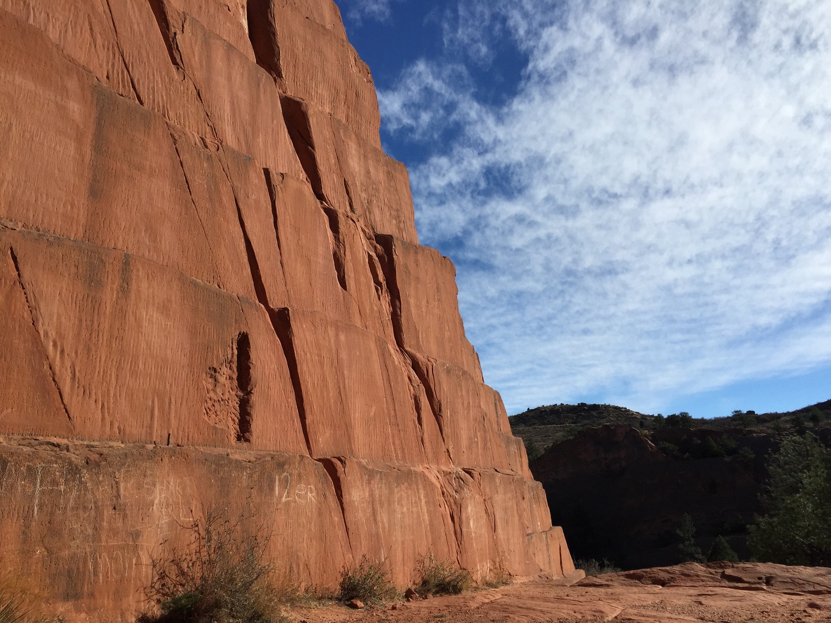 After descending the steep series of steps carved into the bright red rock, turn left to follow the Red Rock Canyon Trail, which follows another, wider canyon carved out of the brilliant sandstone. Interpretive signs along the way describe the geologic and human history of this land, including the construction of a fallout shelter here during the Cold War.