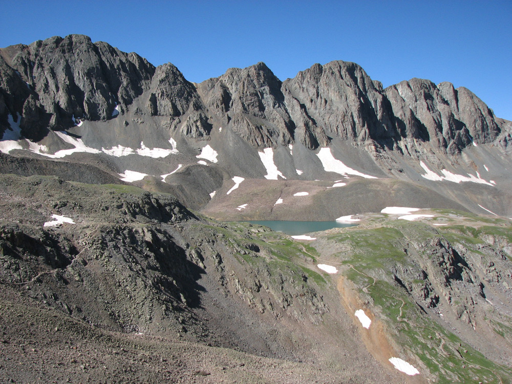 From the parking lot at the end of the 4WD road at 11,600 feet, the easy-to-spot trail veers south, winding through the extensive fields of columbine, paintbrush, and many other wildflowers carpeting American Basin’s upper slopes. At about 12,200 feet the path bends to the southeast, then climbs steeply to 12,700 feet before heading towards the basin’s eastern end. Here the route turns right and zig-zags up another slope towards beautiful Sloan Lake.