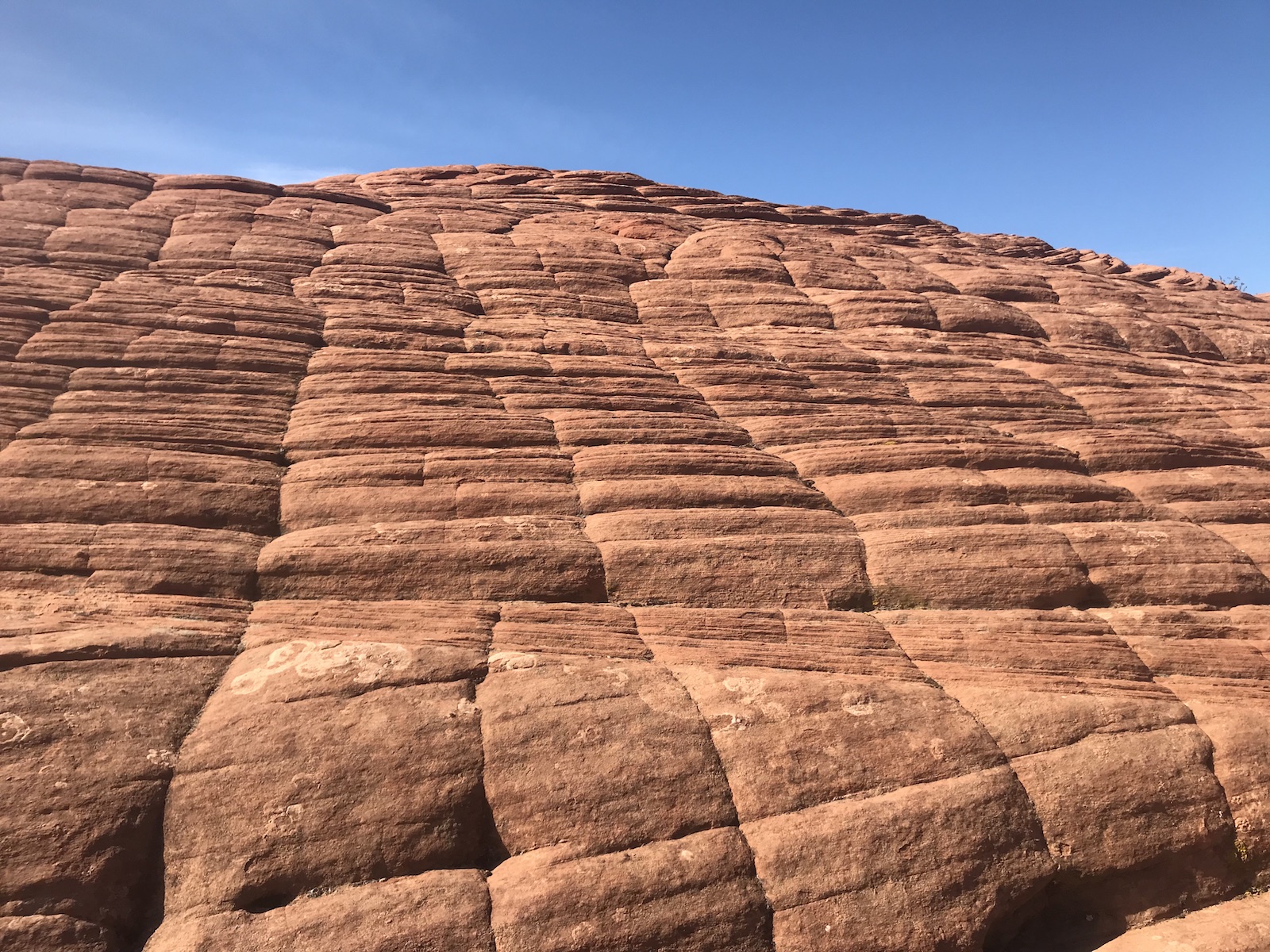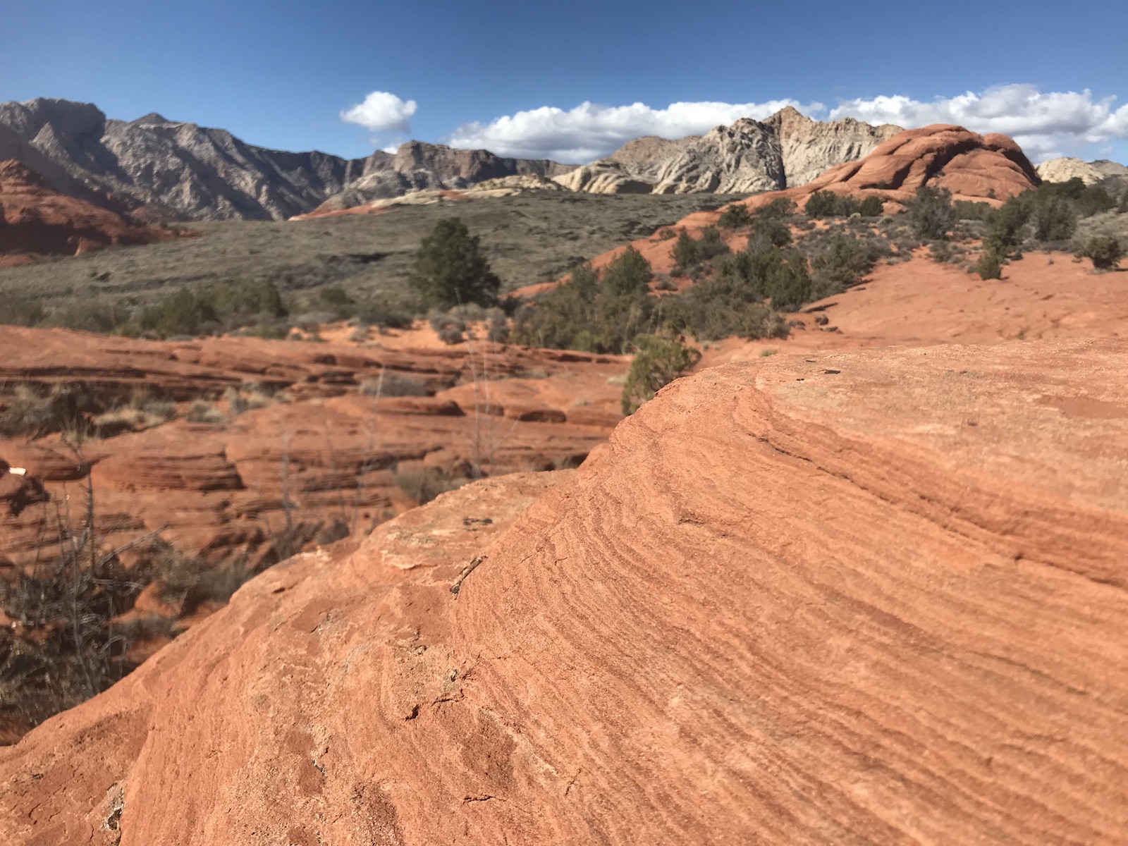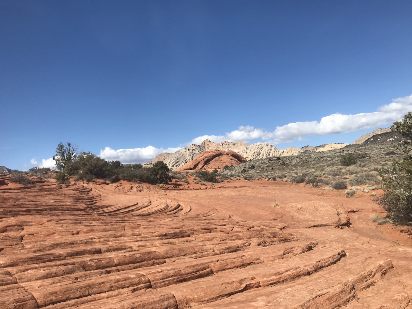 After a flat section through the desert scrub, the trail climbs up the solid waves of the Petrified Dunes. Nearly 200 million years ago, these were vast expanses of soft, quartzite sand. Solidified by wind and water over millions of years, the sandstone was shaped into solid, rippled Martian hills, ranging from vibrant orange to creamy white. Keep in mind that Snow Canyon sits at the intersection of the Colorado Plateau, the Great Basin Desert, and the Mojave Desert, rendering it a rare miracle of geological and biological phenomenon. You’ll definitely sense this as you climb the smoothly carved waves and natural sandstone staircases.