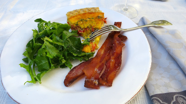 Because quiche or strata are meals in and of themselves, there’s no need to go overboard with sides. But don’t forget the bacon—for many people it’s just not brunch without a couple crispy strips. Bake the bacon in the oven (400 degrees for 15 to 20 minutes) on a foil-lined sheet pan to avoid a grease-splattered stovetop. Serve on a platter. Let simply dressed—olive oil, lemon juice, salt, and pepper—greens stand in for potatoes for a pop of color and freshness.