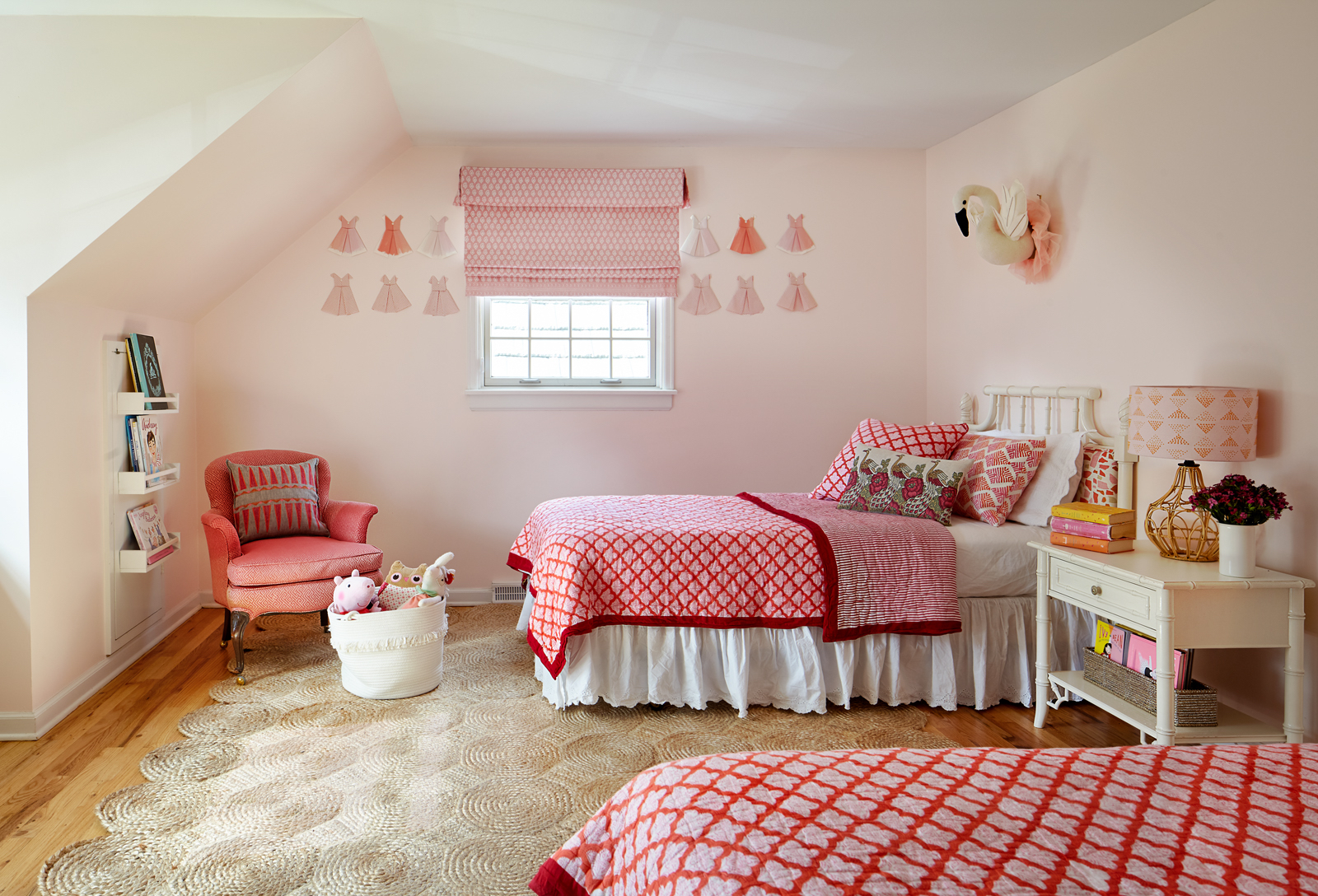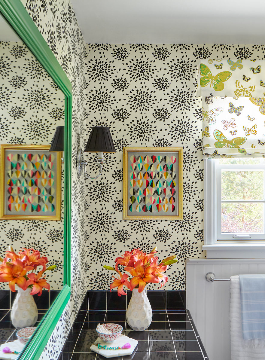 The key to incorporating patterns, Knauf says, is fearlessness. She suggests experimenting in small rooms, where a busy design is less likely to feel overwhelming. In the girls’ bathroom, for example, she combined two patterns: The wallpaper is Albert Hadley’s Fireworks print, and the window shade shows off whimsical butterflies with touches of green that play well with the aforementioned mirror. “If we had done that in the living room, it would maybe have been overwhelming,” Knauf says. “With teeny-tiny rooms, I think you can take a little bit more risk.”