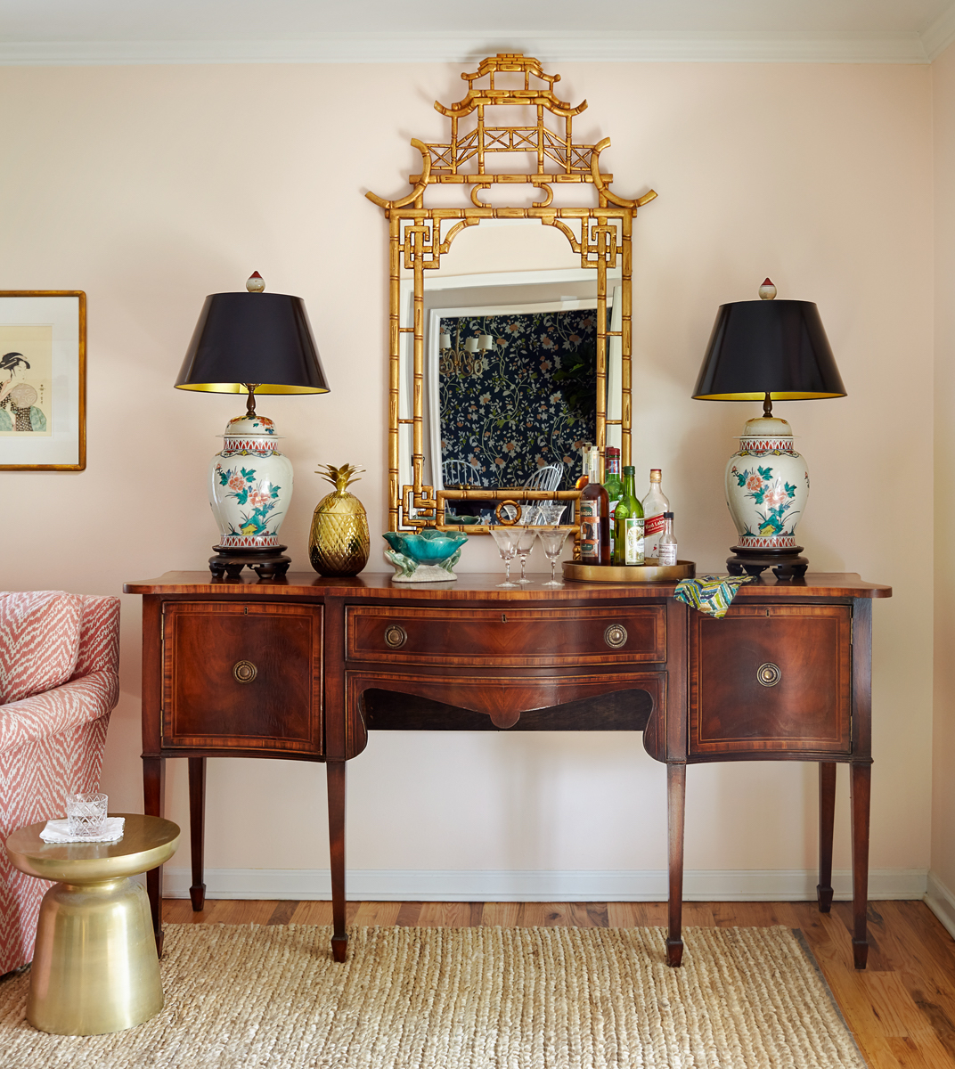 The transformed antiques fit seamlessly with the rest of the house, a veritable study in daring pattern and color selections. The living room, painted Benjamin Moore’s cheerful Queen Anne Pink, is populated by chairs reupholstered in a peach zig-zag pattern and two inherited lamps updated with black-lacquered shades—just edgy enough to keep the room from feeling saccharine-sweet. The dining room sports a Bob Collins & Sons Chippendale navy wallpaper with a sprawling vine-and-flower motif.