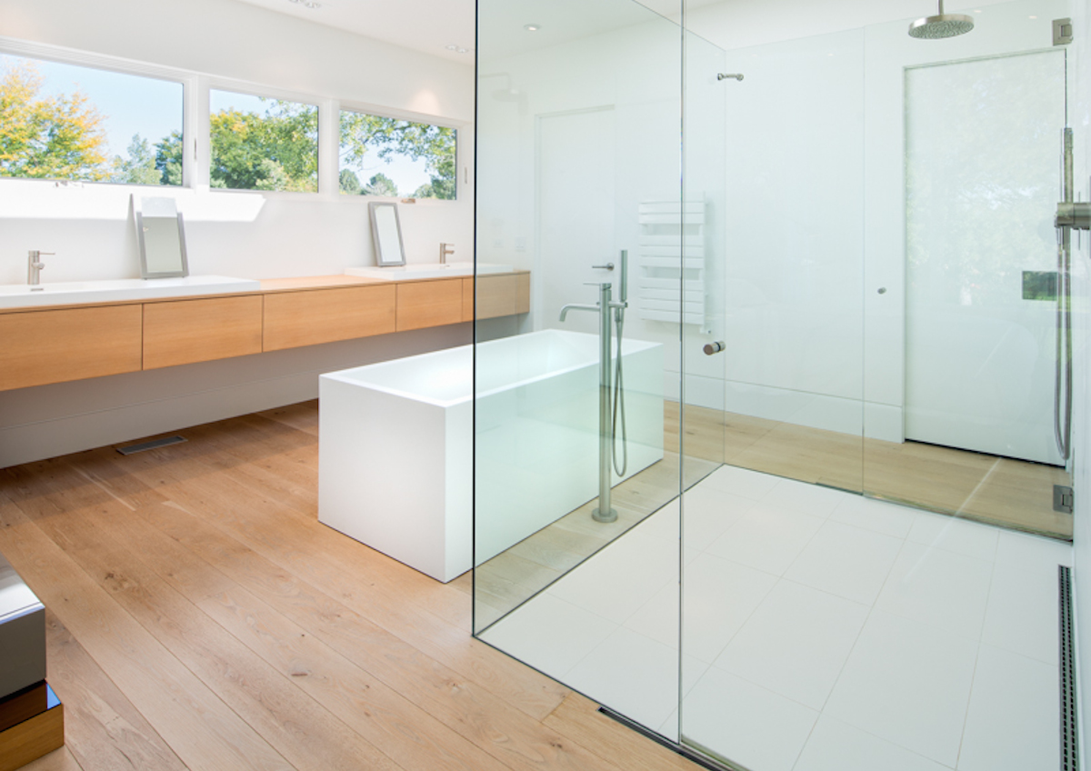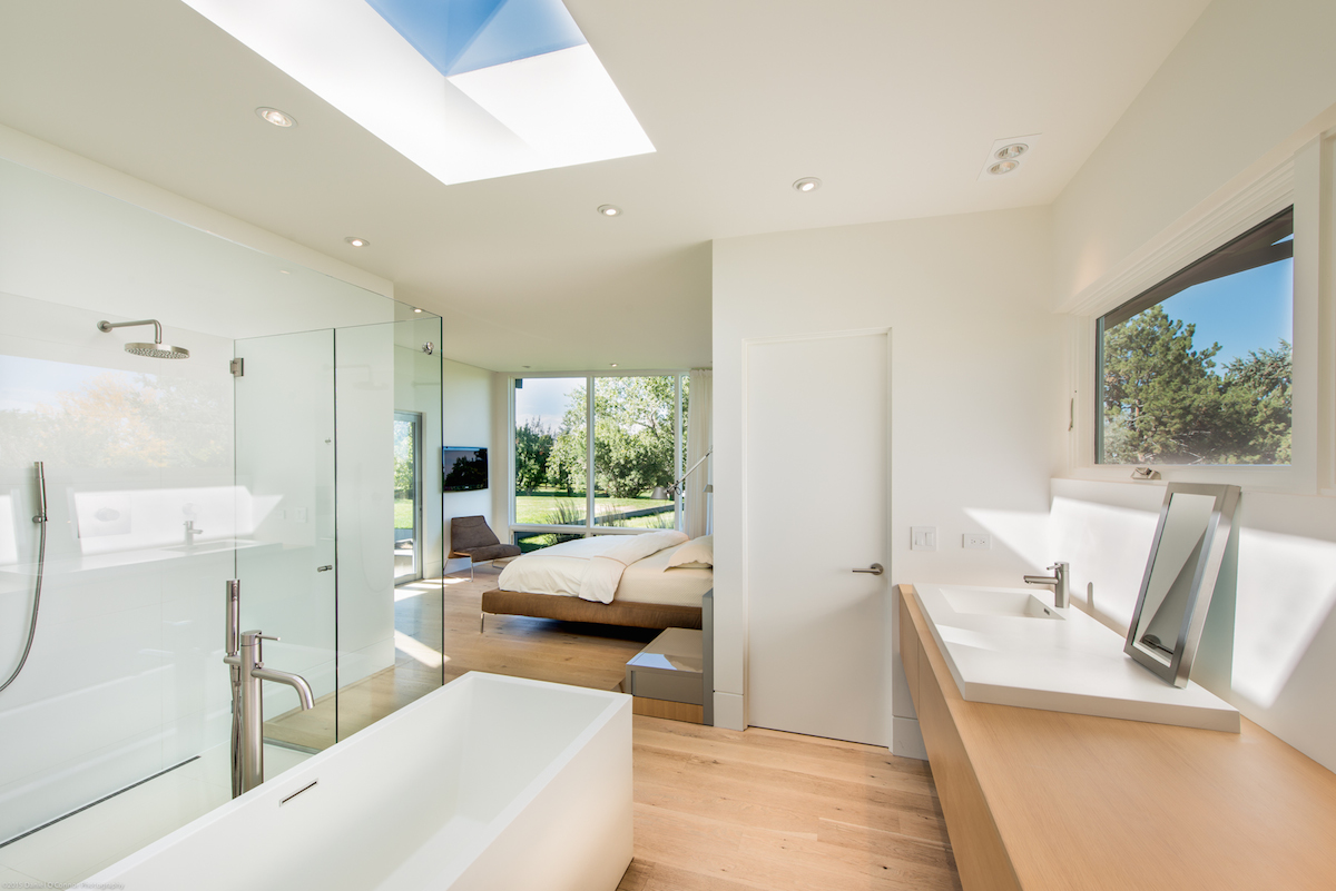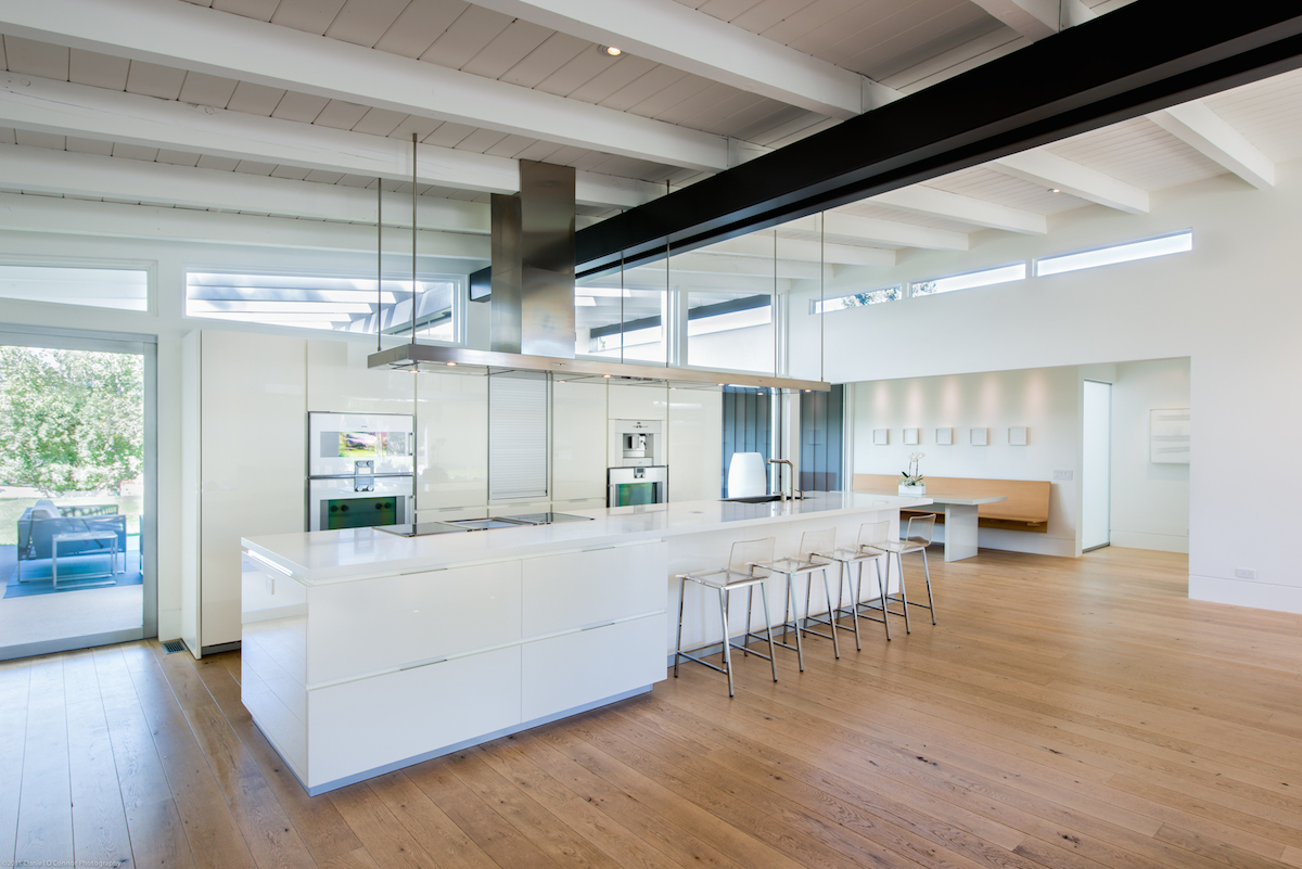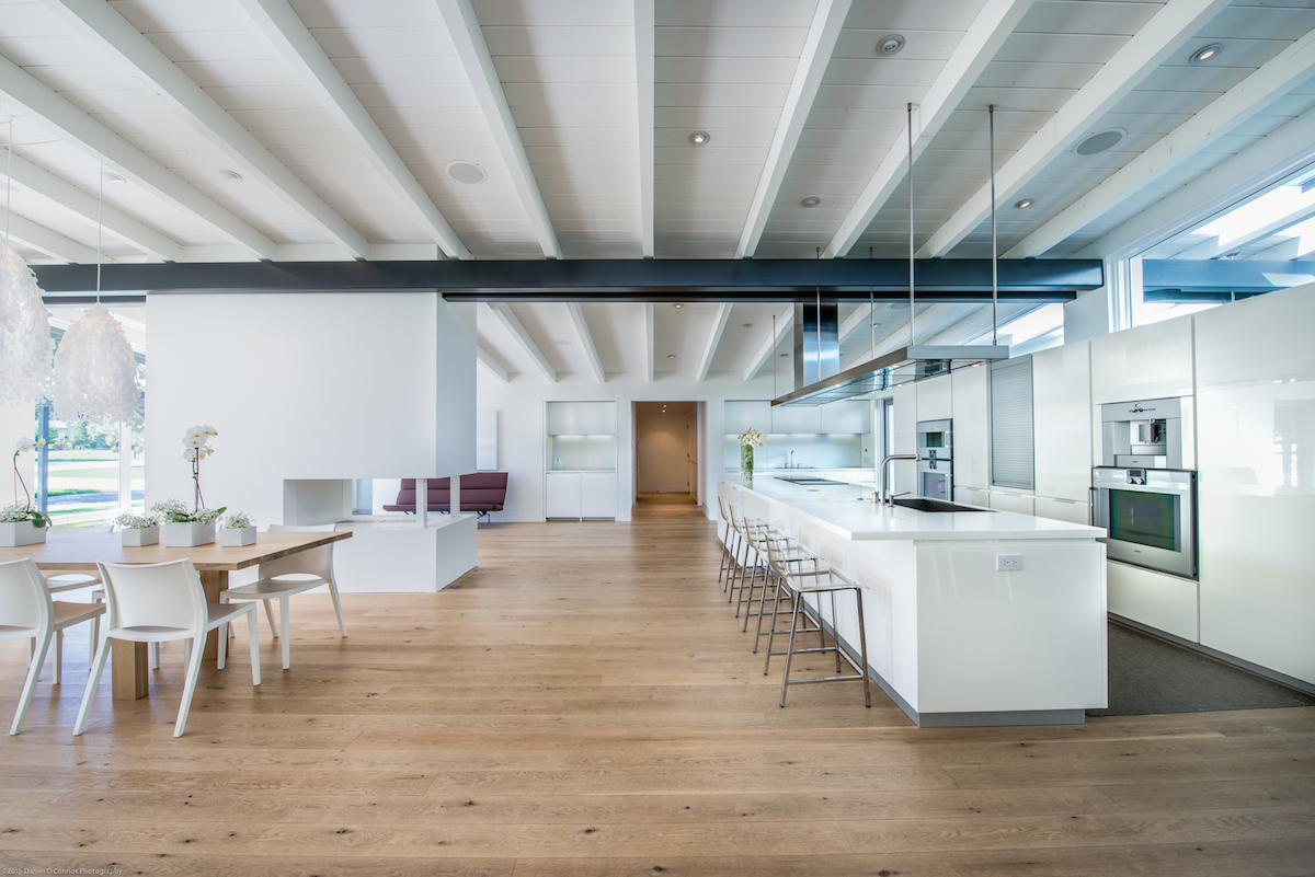 Adding only 400 square feet to the home’s footprint, the renovation kept the exterior integrity of the home. But once inside, it’s a whole new world. Custom white-oak floors connect the entire first floor, complementing the home’s simple, white surfaces and thoughtful design. After entering a sunny foyer, visitors move into the large living/dining/kitchen space that anchors the home. A Varenna kitchen from Studio Como takes center stage. The appliance wall—featuring Gaggenau, Thermador, and Miele tools—faces a sleek cooktop built into an extra-long breakfast bar, perfect for entertaining.