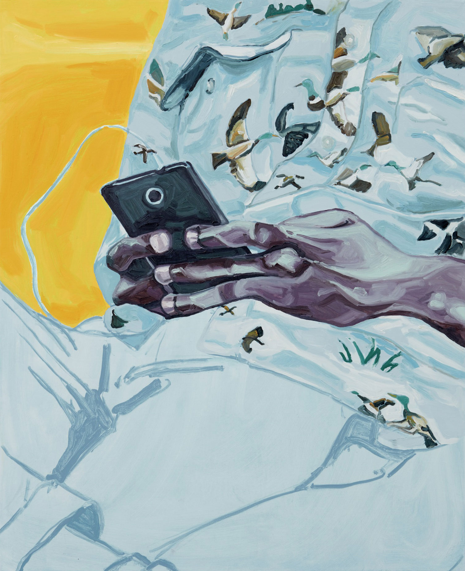 For each portrait, Casteel relies on multiple photos of her subjects, taken to serve as a reference rather than as documentation. Recent portraits, including “Sylvia’s” (2018) and “Fatima” (2018), which were purchased by the DAM, celebrate women of color who are also business owners. “Jordan has also moved from doing straight portraits to what she calls the Subway or Detail series,” says Hart, mentioning several—”Flight” (2018, pictured below) and “Just sayin’” (2018)—which are in the show. In these pieces, Casteel captures people at ease in surroundings that often go unnoticed.
