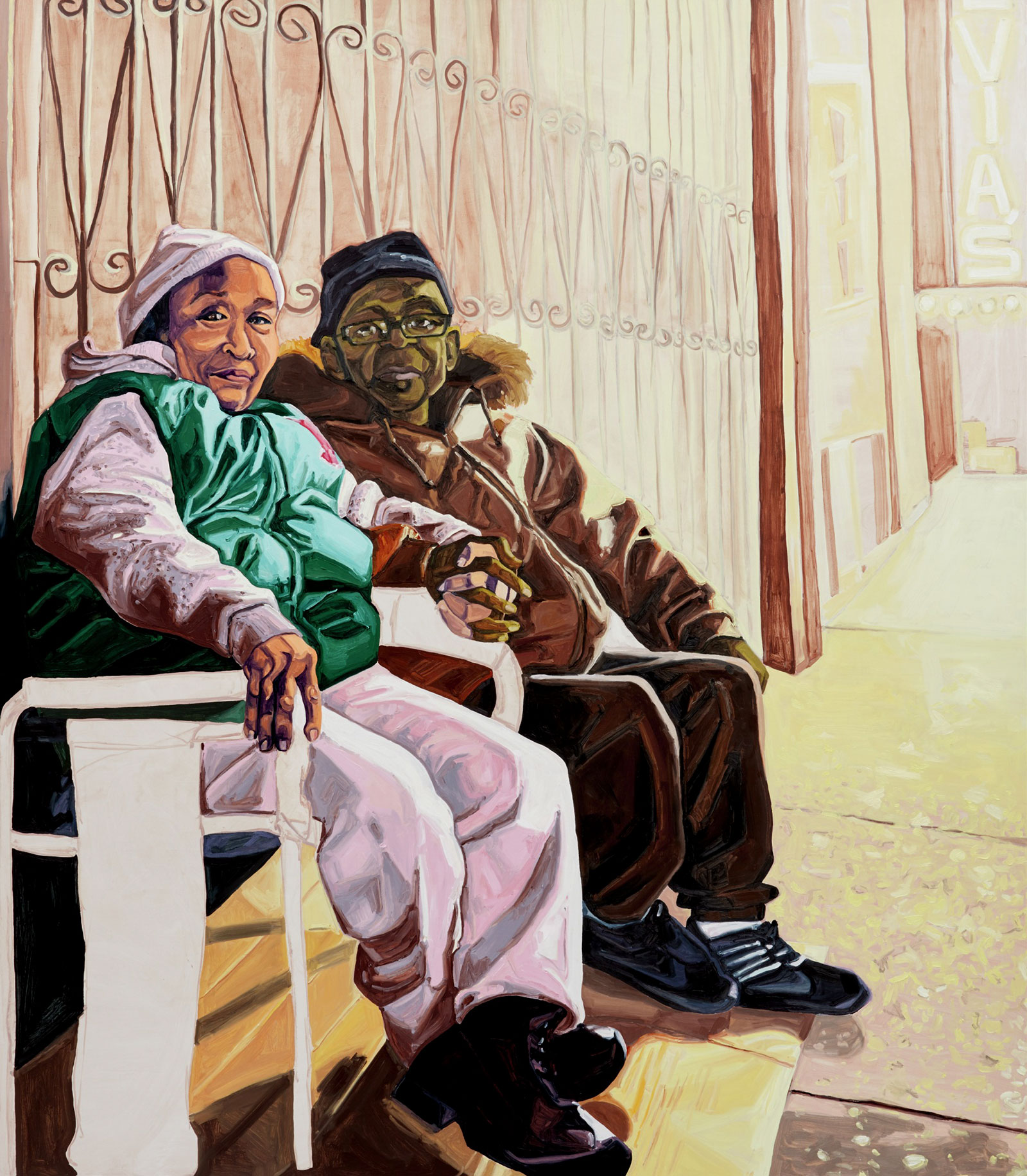 The exhibit begins with several portraits of Casteel’s community here in Denver, before showcasing her neighbors in New Haven and New York. In the show is “Benyam” (2018, pictured below), featuring the proprietors of an Ethiopian restaurant Casteel frequents near her Harlem apartment, who, in Casteel’s words, “offered their spirits for a painting.” There’s also “Galen 2” (2014), a naked black man sitting alone in a kitchen, painted in vivid greens and blues—a play on the term “people of color”—forcing observers to address their assumptions about a body before investigating. In “Yvonne and James” (2017, pictured below), an older couple, Casteel’s “heart beat in Harlem,” sit holding hands, basking in a soft, diffused light.