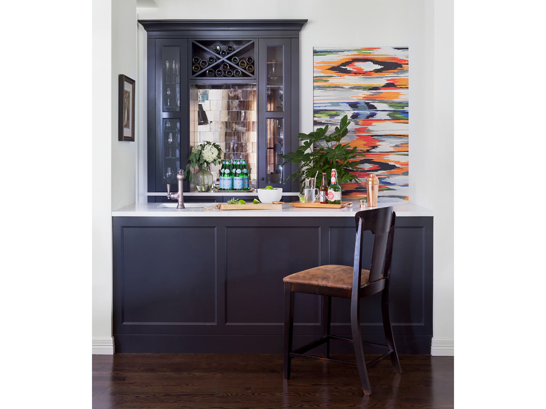 Timeless white and gray William Ohs cabinets embody this directive, Pruett says: “That small double bevel in the panel—versus a standard Shaker door—was the level of detail they were looking for.” Plus, you can’t get more classic than white—made more elegant with high-contrast black perimeter counters and oversize black-and-bronze pendant lights. An Ann Sacks mosaic above the range and a custom steel hood with traditional lines give the space wow points—and hardworking granite on the island ensures it withstands chefs of all ages. “The overall feel is timeless and casual for a growing family,” the designer says—with nary a ’90s style trope to be found.