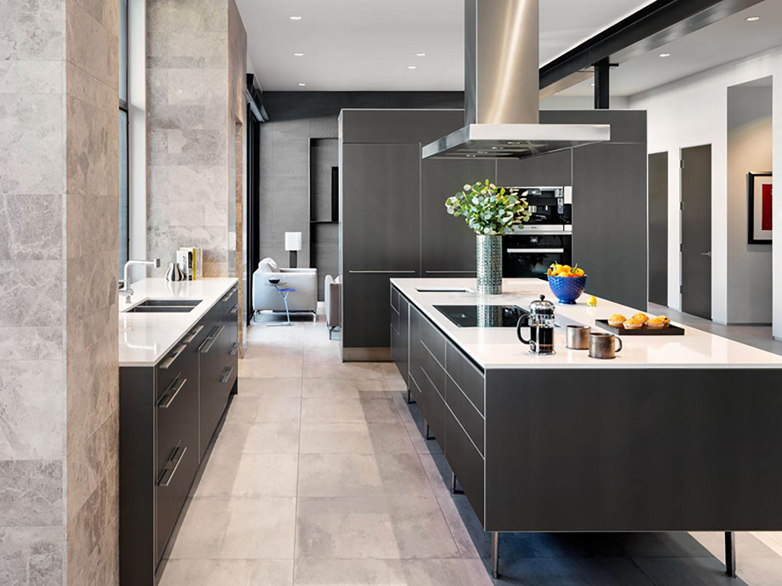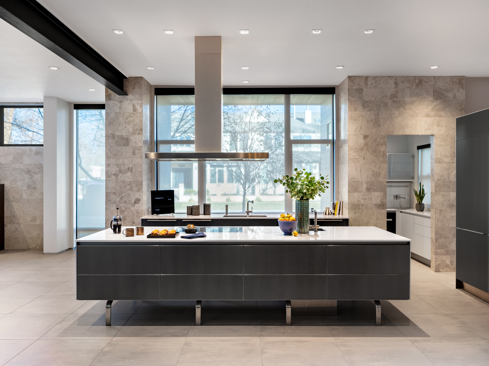 The minimalist design doesn’t forego function. The paneling is fingerprint-resistant, and the counters are heat-resistant. And while the hidden scullery is the main store room and prep area, the central kitchen also has storage on the backside of the island and in recessed drawers, so guests leaning against the counter don’t bump against handles. A bar opposite the integrated ovens invites guests to spread out in the open space. The only thing the designers didn’t provide? The dinner-party menu.