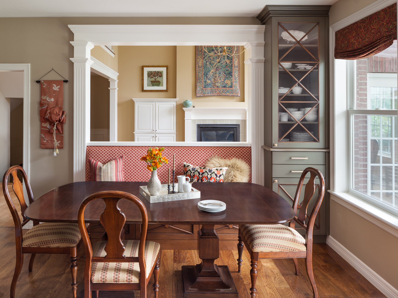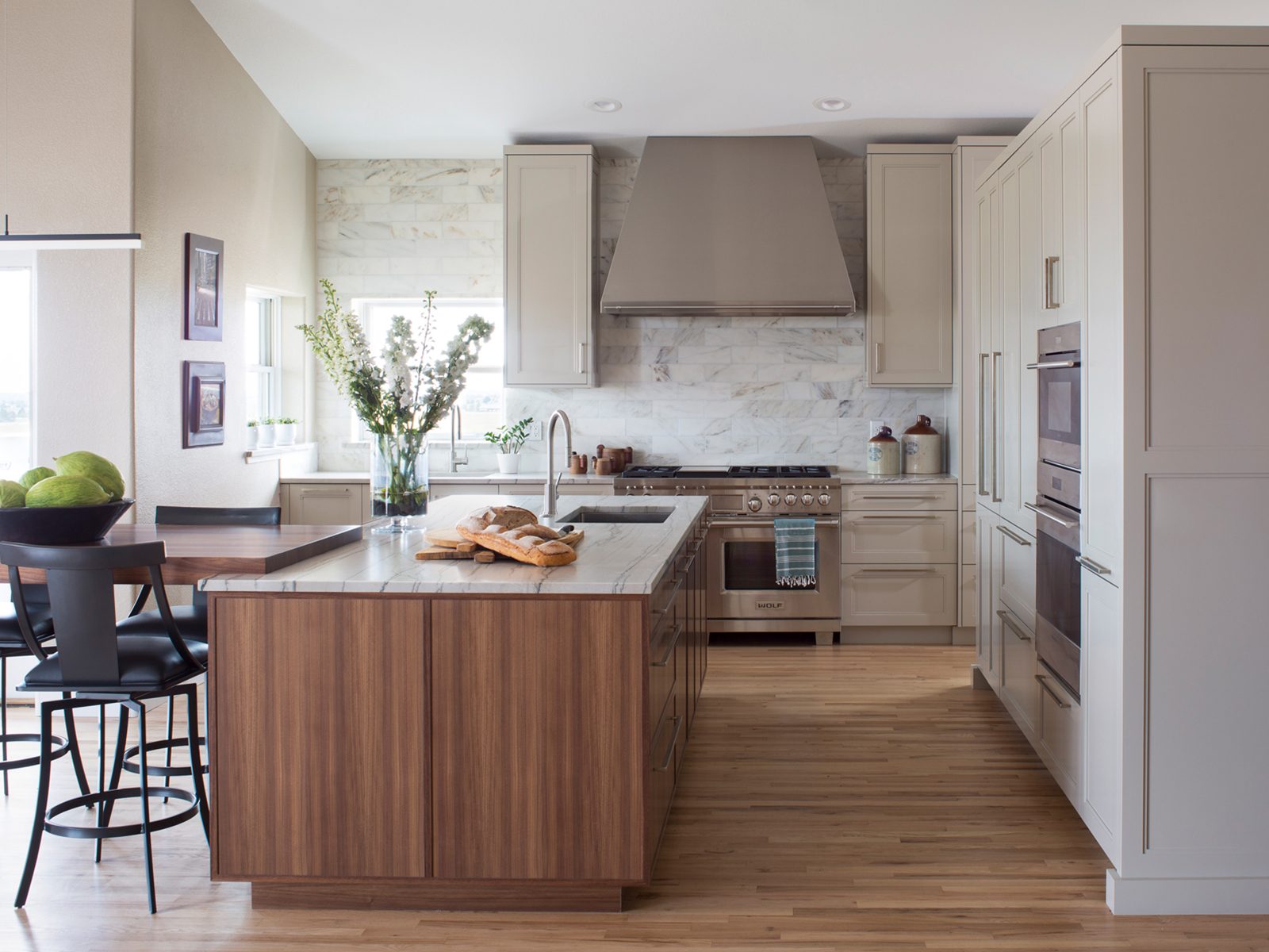 Step two for La Hay was lightening up the color palette and creating a connection to the outdoors. (The home, built in the late 1980s, is nestled into the foothills of Loveland and surrounded by farmland.) La Hay accomplished those goals by dreaming up a walnut-topped extension to the new island; incorporating brown, green, and gray tones in the finishes; and adorning the Artcraft Kitchens cabinets with handmade bronze hardware (from Rocky Mountain Hardware) that sports a subtle organic texture. “Anything overly manmade, with too much shine, would have been out of place in the home,” she says.