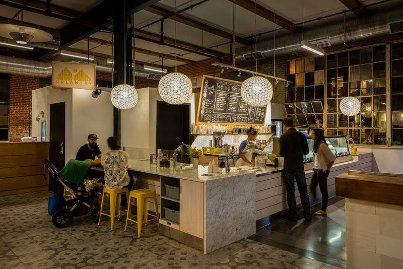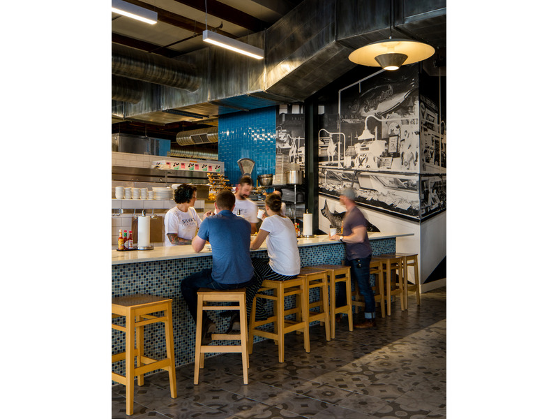 Ask architect Brandon Anderson to share his inspiration for the space, and he uses adjectives like “open,” “appropriate,” and “cohesive”—more mellow descriptors than you might expect from a principal at LIV Studio, which created eye-popping sites such as Sushi-Rama and Glazed & Confused. But a shock-and-awe strategy was never the intent. “Our goal was to make everything fit with the building,” he says, a task made easier by the fact that most of the vendors followed Wolf’s lead by choosing LIV as their designer. “A few vendors have their own shops nearby, and we didn’t want to lose their individual flavors, so we held the reins lightly,” Anderson says. “We wouldn’t want everyone to put a unicorn on the back of a storage compartment from a Coke truck, like Crema Bodega did—but we loved that little bit of funkiness, and it was great to have a few vendors do something unusual.”