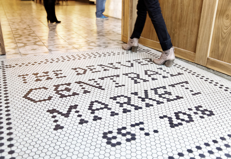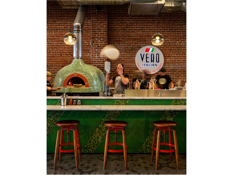 The space’s cohesiveness is immediately evident as you move from the entrance’s arched brick facade into an identically curved glass-topped vestibule. A few steps away, Temper Chocolate’s French truffle case features a rounded glass countertop that elegantly slides back so you can get a close look at your favorite confections. Throughout the space, Daltile ceramic tiles—from the porcelain floors with romantic patterns etched in shades of gray to Italian shop Vero’s beautiful green-and-red pizza oven to the ocean blue tiles that frame Silva’s case of fresh fish—reinforce the classic feel and provide the durability needed in a working market.